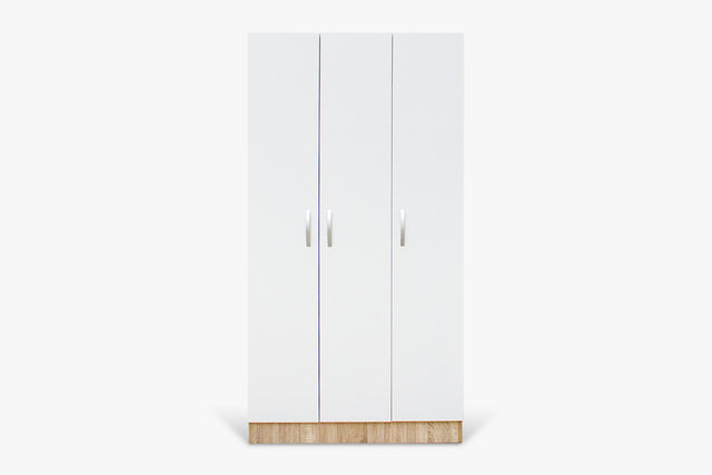 The Escot Collection keeps it simple and clean — just what you need for a tidy bedroom. With its white and oak color, this Escot 3-Door wardrobe fits nicely in small spaces and goes well with any décor. It has two compartments: A full-length hanging section with a shelf above for folded items on one side. A vertical organizer with five spacious tiers on another side. Perfect for storing clothes, shoes, or accessories. This closet gives you extra storage without taking up too much room. Whether it's clothes, shoes, or everyday items, this wardrobe helps you stay organised while keeping your room looking fresh and modern.