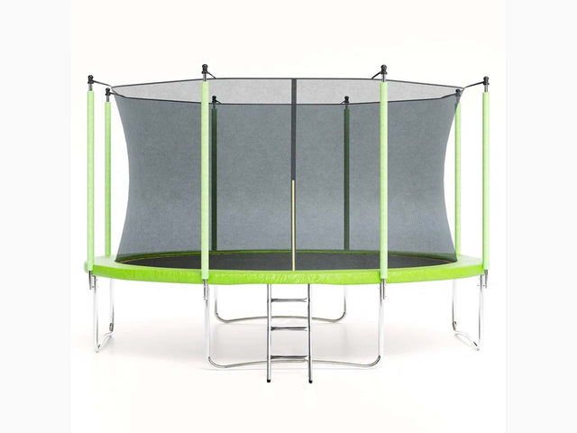 Bring excitement and safety together with the Trampoline in lime. Perfect for family fun and outdoor fitness. Built with a strong galvanized steel frame and reinforced T-joints. This trampoline ensures superior stability and durability. The W-shaped legs provide a solid foundation. The high-quality PP jumping mat offers an excellent bounce every time. Featuring a full enclosure net, padded safety edges, and a removable ladder. This trampoline lets everyone jump with confidence. Designed for lasting use and endless enjoyment in your backyard.
