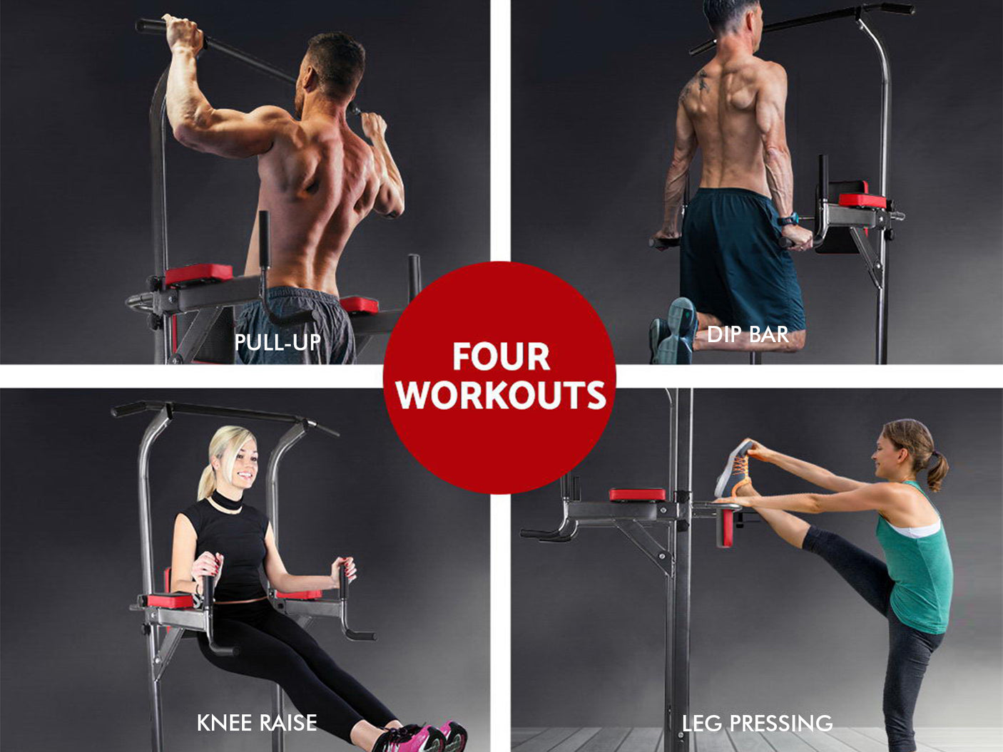 Bring the gym to your home? This comprehensive power tower is all you need for a great total body workout, offering a huge range of exercises for your upper body and core.It offers a range of exercises such as bench presses, chin ups, dips, pull-ups, weight lifts, leg raises, push-ups and more.Constructed from heavy-duty, powder-coated tubular steel, the power tower is durable and strong. The large feature is anti skid foot pad that will prevent unwanted movement .High-density and sweat-proof cushioning,soft padded cushion,for truly safe and comfortable training regimes.