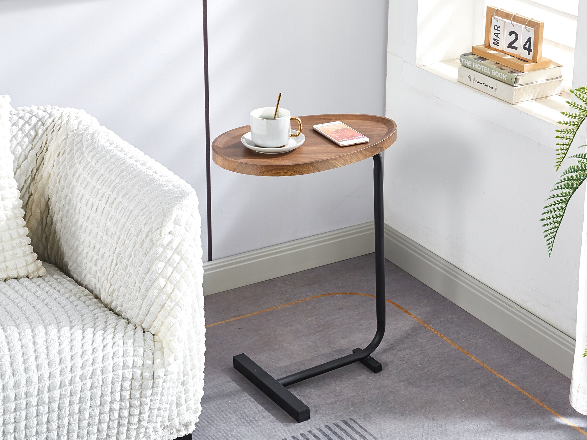 End Table | Walnut Finish & Black Metal Frame | Oval-Shaped Compact Side Table