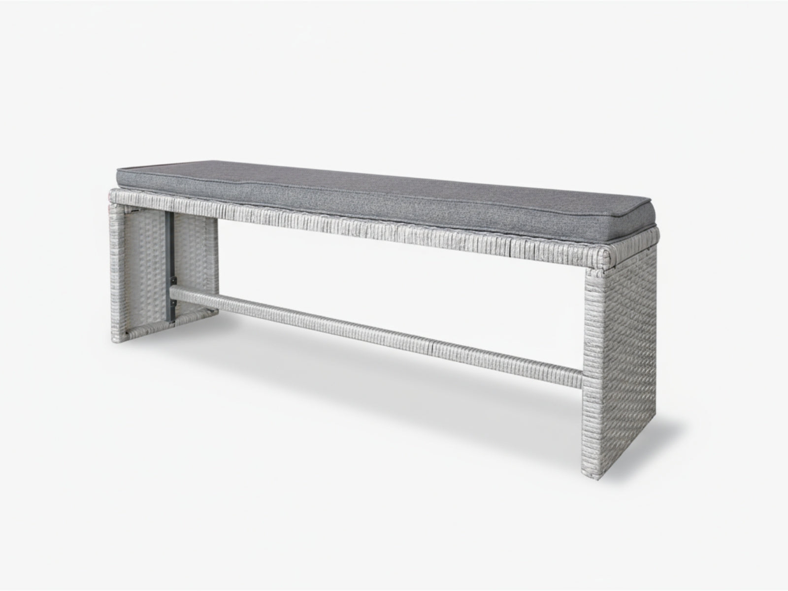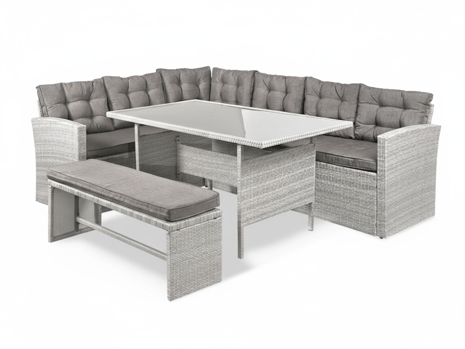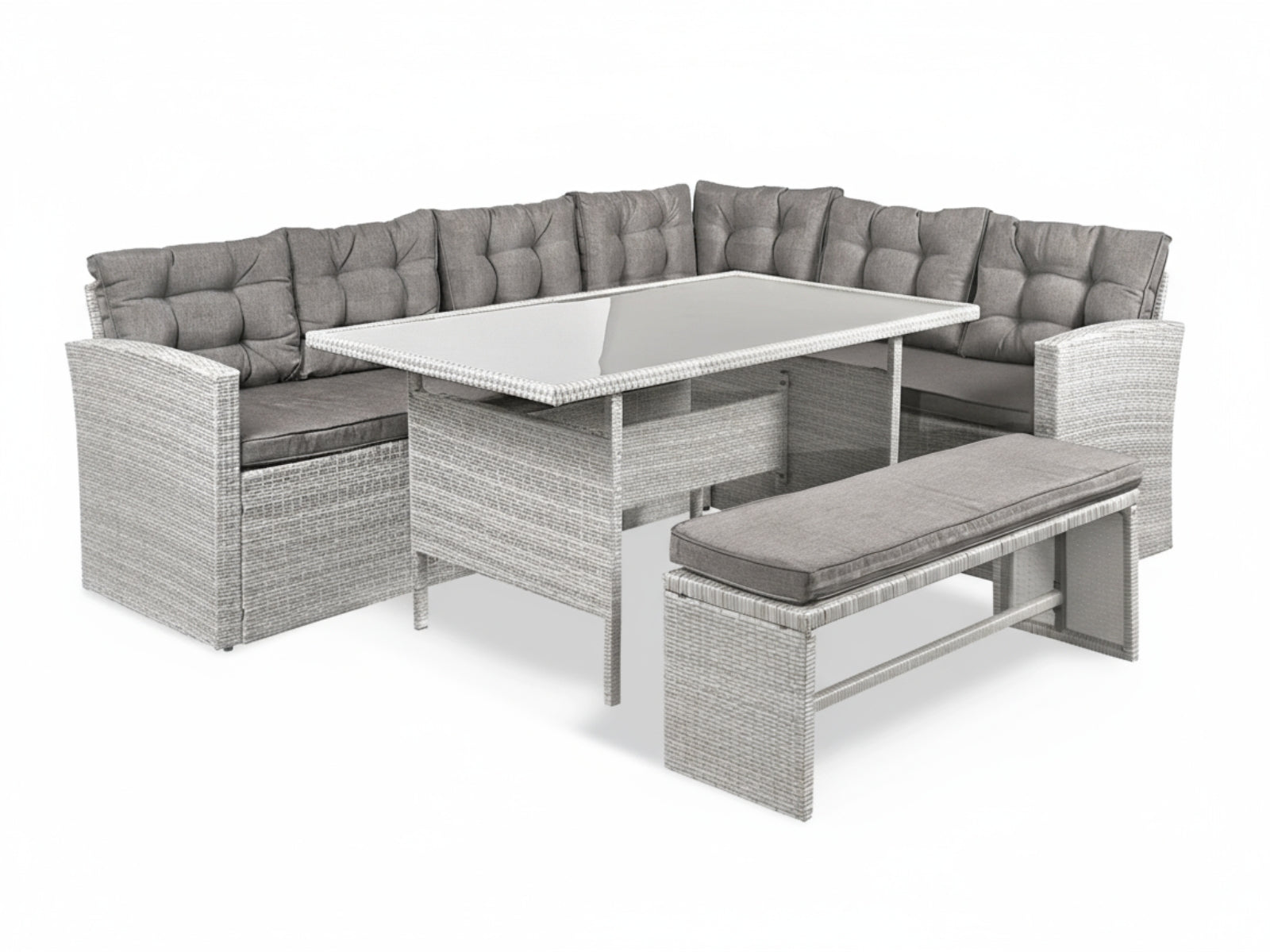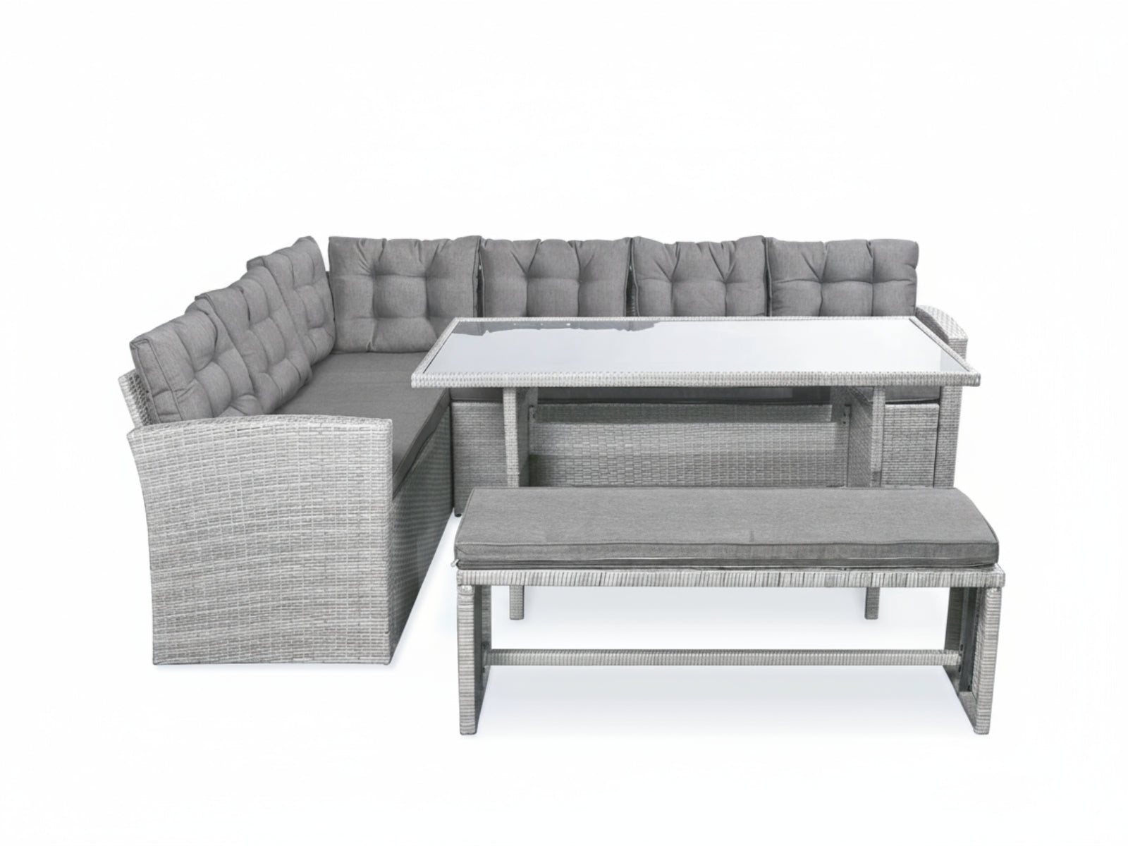 Enhance your outdoor dining experience with the Catania 4-Piece Steel Outdoor Lounge Set. Crafted with a sturdy powder-coated steel frame and hand-woven light grey PE rattan. This set combines style, comfort, and durability. Thick 5cm grey cushions with water-resistant covers provide all-day comfort. The spacious glass-top dining table and matching bench complete the modern look. Perfect for patios, decks, or gardens. This Catania brings casual elegance to every outdoor occasion.