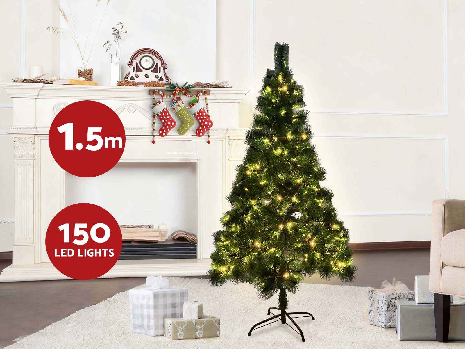 Full of festive brightness, the LED Christmas Tree is designed to light up the season with charm. Made from new PET, it features 170 thick tips that fan out with lush, natural-looking foliage. Creating a realistic and symmetrical shape. The tree comes pre-lit with 150 LED lights and decorated with pinecones, offering a warm, welcoming glow. A sturdy powder-coated metal stand provides enhanced stability. The low-voltage design ensures safe use. Quick to assemble and built to last, this tree is part of a 3-model range with different heights, tip counts, and designs to suit every home.