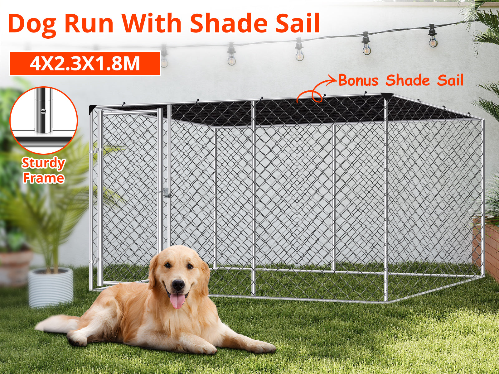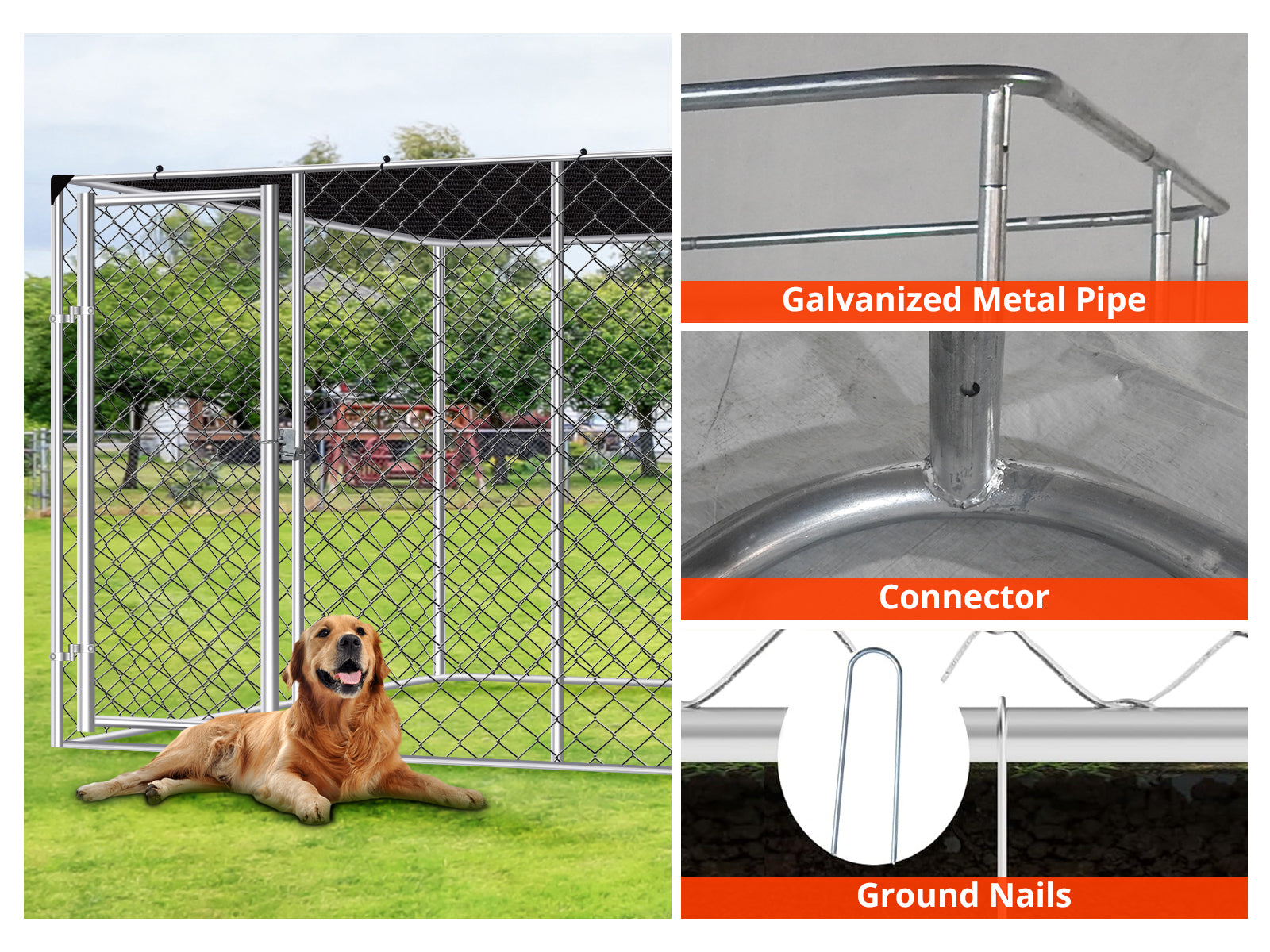 Keep your pets safe with this outdoor galvanized steel frame dog run. This multipurpose dog run is ideal for training, playing or exercising. The sturdy and heavy-duty galvanized steel construction and chain link mesh ensure your pets stay out of trouble while providing ultimate ventilation, also allows your pet to move about freely with no chance of them slipping out of the sturdy structure.