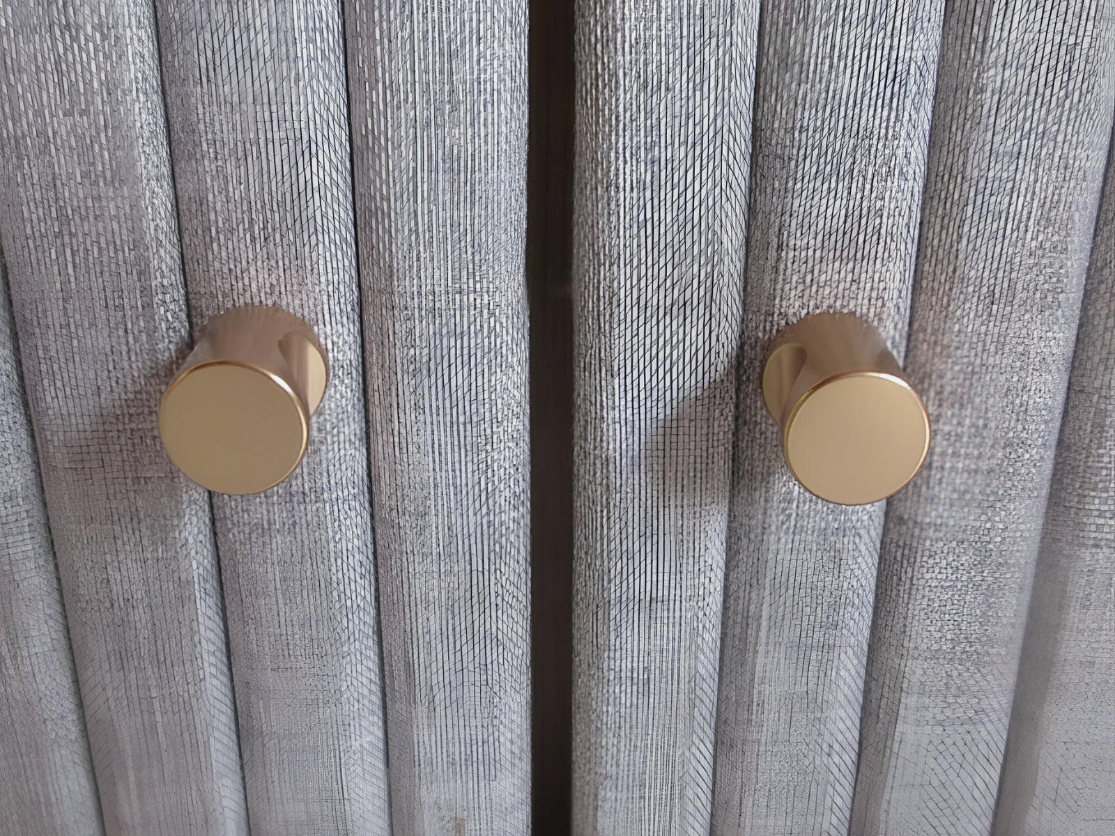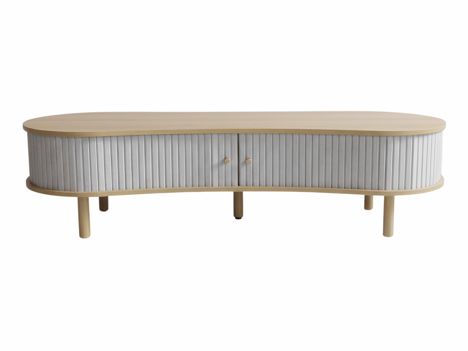 Inspired by the epitome of Mid-Century Modern design. The Ayla collection delivers functional, stylish, and space-saving furniture solutions. Embrace retro charm with the Ayla Tambour TV Stand, a sleek nod to mid-century modern style. Wrapped in soft grey fabric, its sliding tambour doors glide smoothly. Offering ample storage for your media essentials. Complete with oval silhouettes, golden handles, and an oak-finished frame. It adds warmth and elegance.