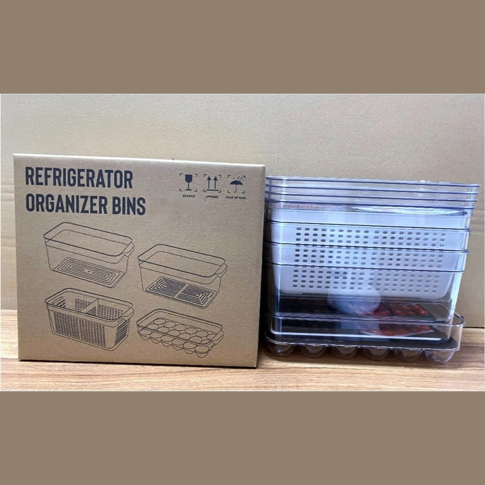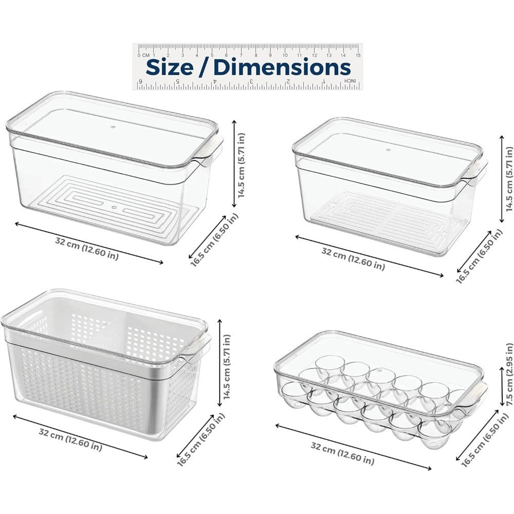 This 4-piece fridge organizer bin set is designed to keep fruits, vegetables, and eggs fresh and organized. The containers feature lids, drain trays or inner baskets, and are stackable for efficient use of fridge space.
