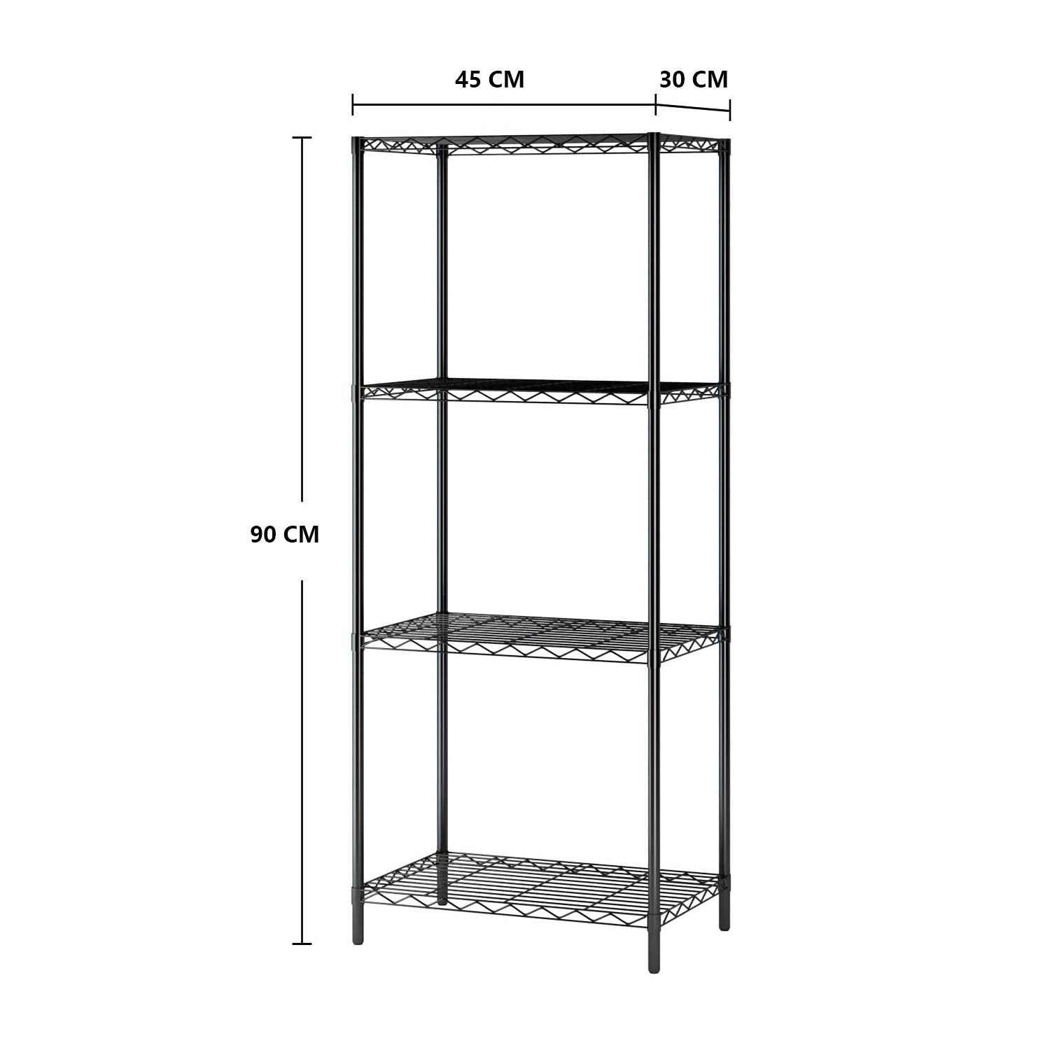 This 4 shelf metal shelves is solid and easy-moving. And it measures 30×45×90cm.So its perfect size makes it great for any place of your home without occupying too much space, such as office, bathroom, kitchen, entryway or closet.