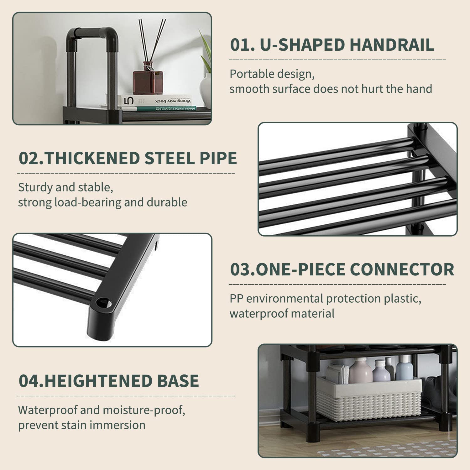 • Flexible Combination: This shoe rack can be separated into different tiers to meet various storage needs. One 5-tier shoe rack can be customized into three lower shoe racks, such as 2-tier, 3-tier.