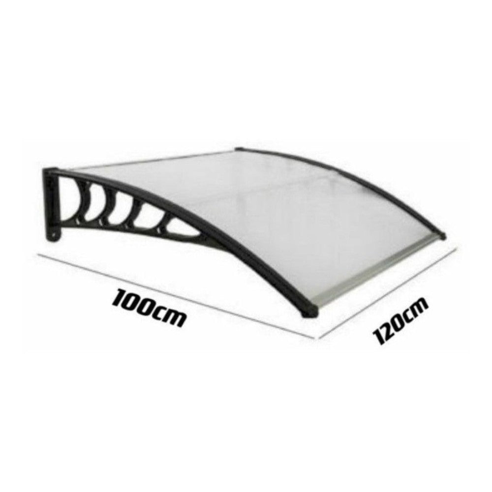 This 100×120 cm door canopy features a robust polycarbonate sheet with UV protection, supported by durable PP brackets and a lightweight aluminum frame. Ideal for providing cover above doors or windows.