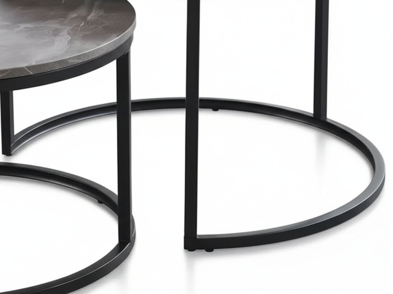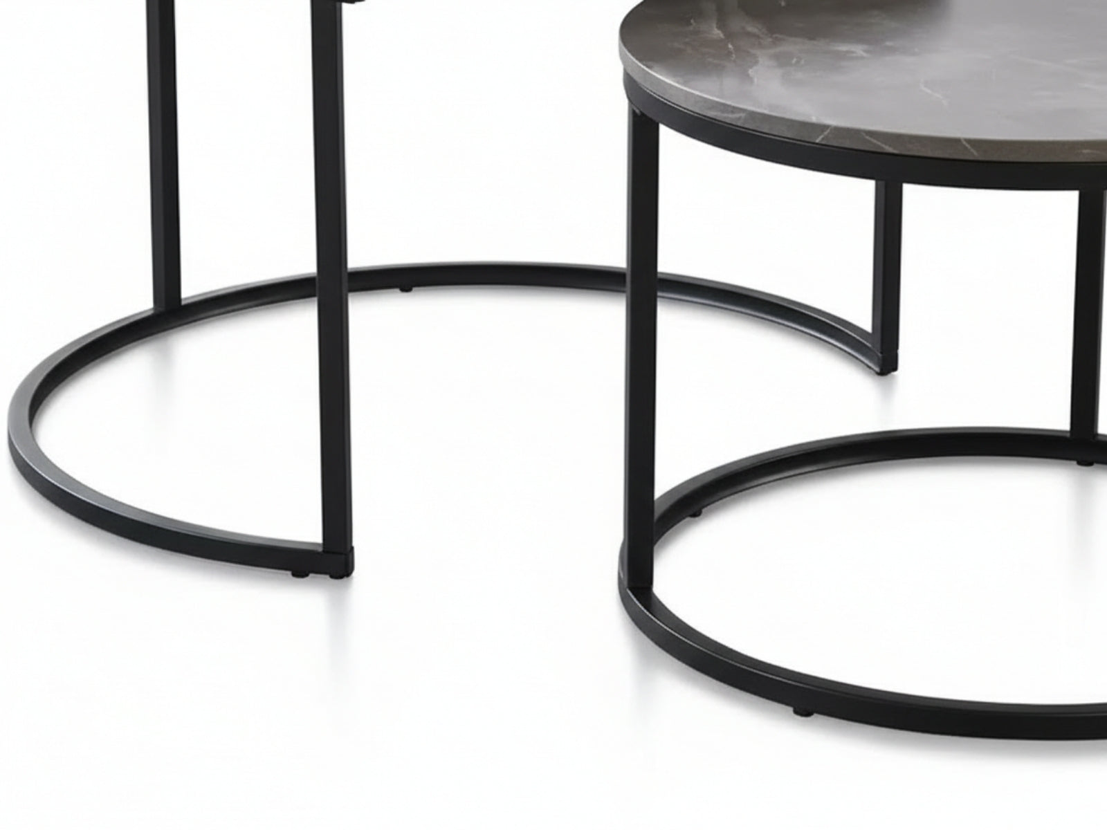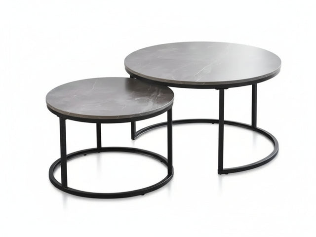 Add modern style and function to your space with this stackable Nesting Coffee Table set. The marble-look tabletop made of 1.6 cm MDF panel and the black metal frame bring a sleek look. Use them together to save space or apart for extra surface area. Strong, simple, and stylish—perfect for any modern living room.