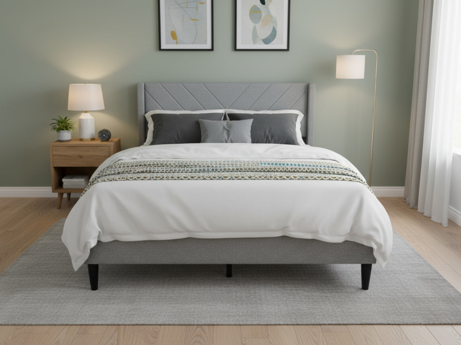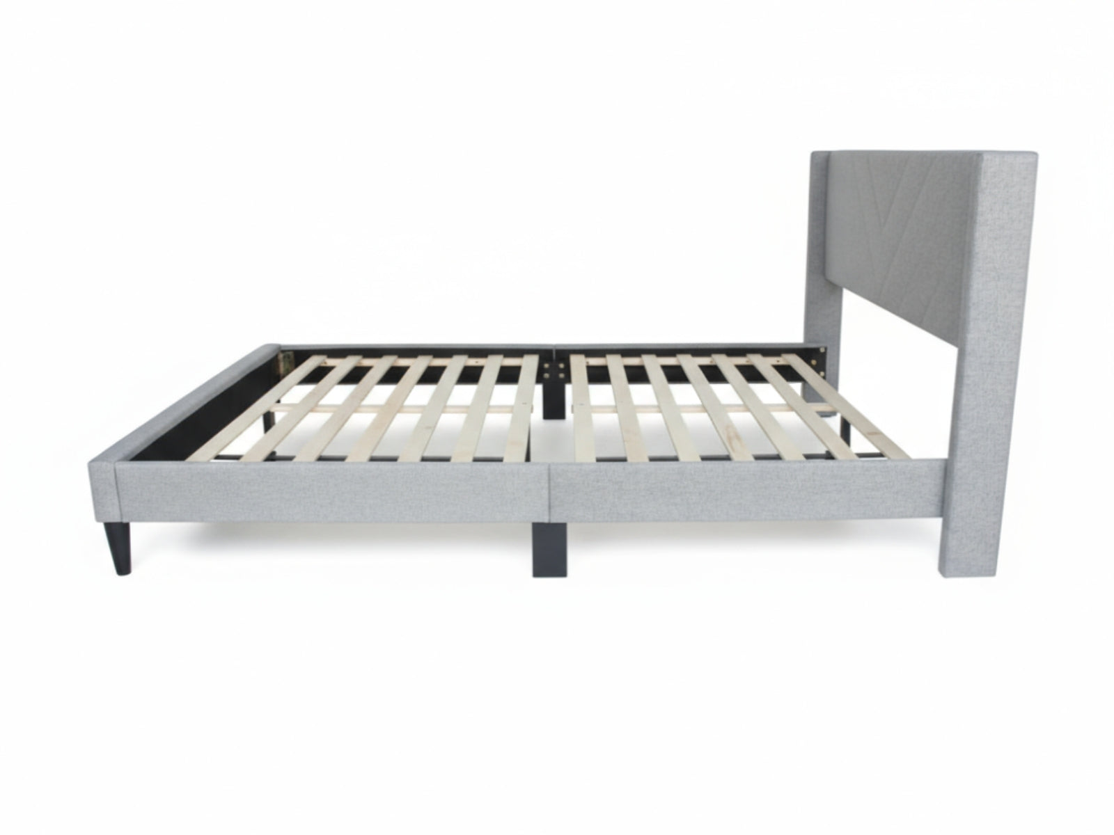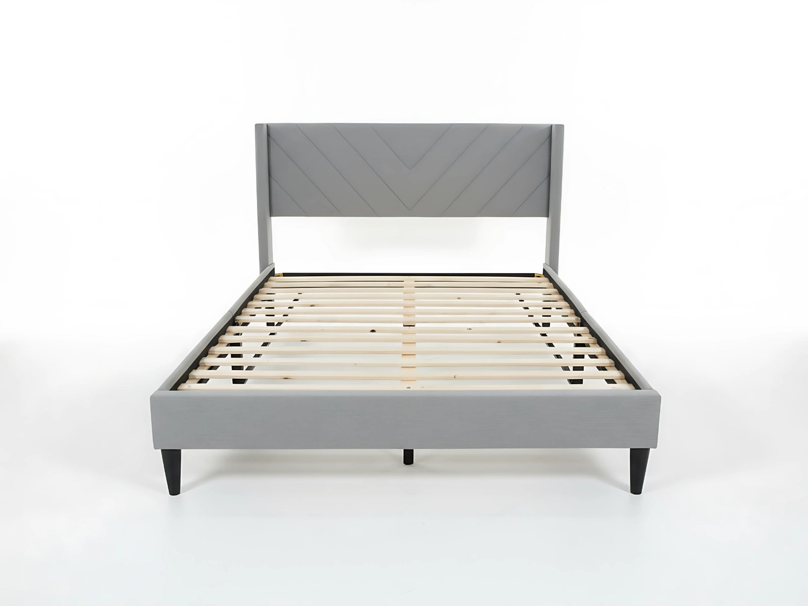 Light grey fabric with V-shaped headboard for a sleek, modern style