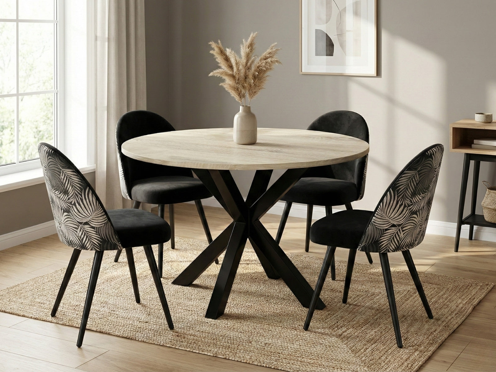 Elsie Round Dining Table - 110 cm & Fernando Dining Chair with Fern Pattern - Set of 4 (Combo)