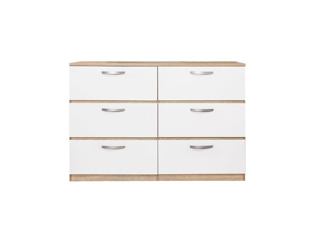 Inspired by minimalism, the Escot 6-Drawer Lowboy  features a clean oak-look frame paired with a white drawer front and sleek silver handle. Includes 6 drawers, perfect for storing essentials and keeping items within reach. Its neutral tones blend seamlessly with any modern bedroom decor. range.