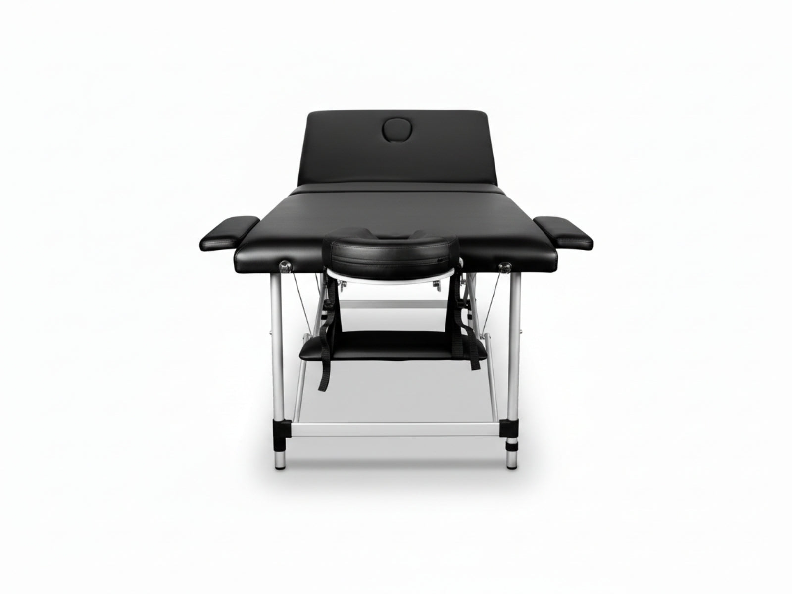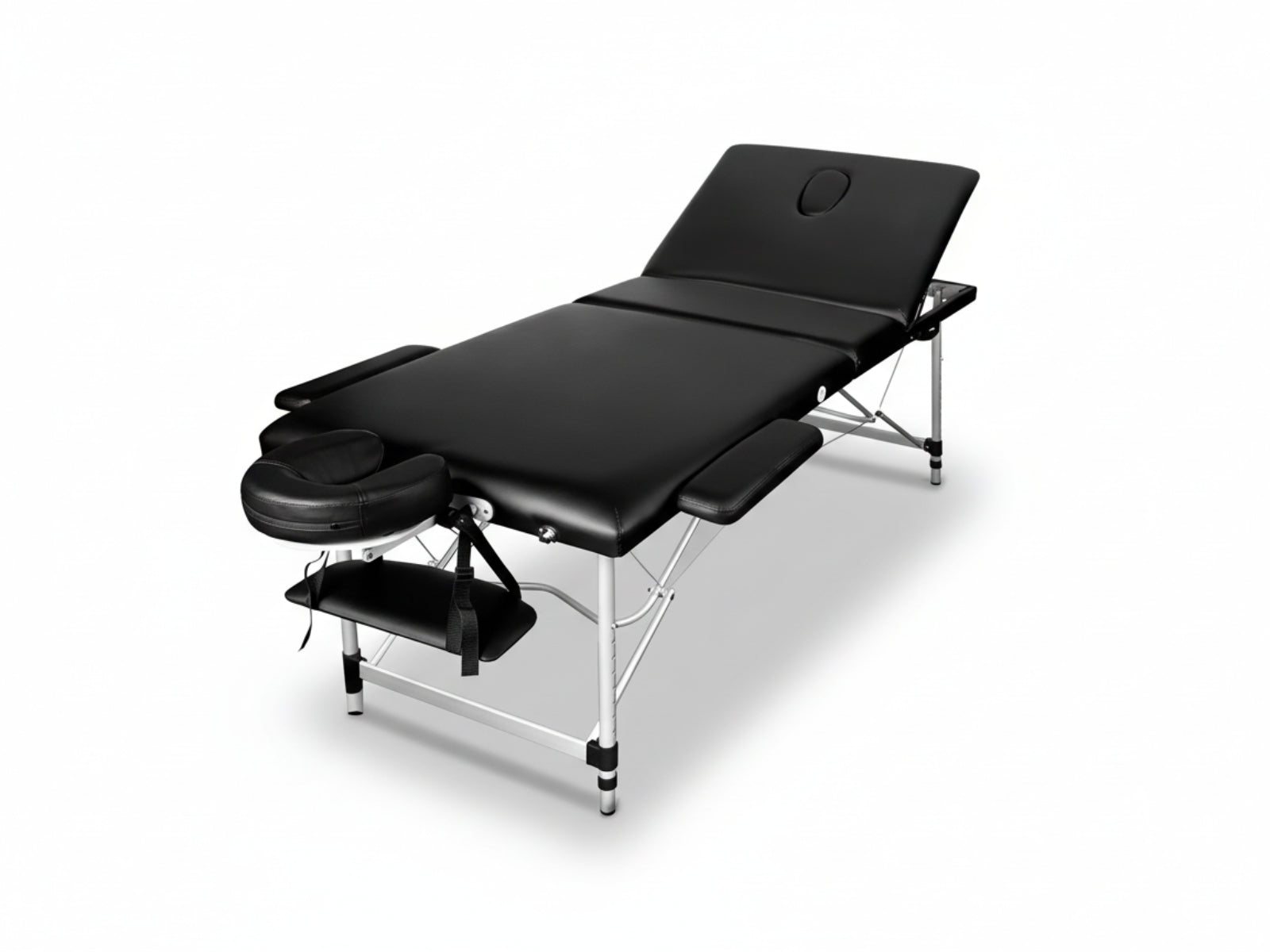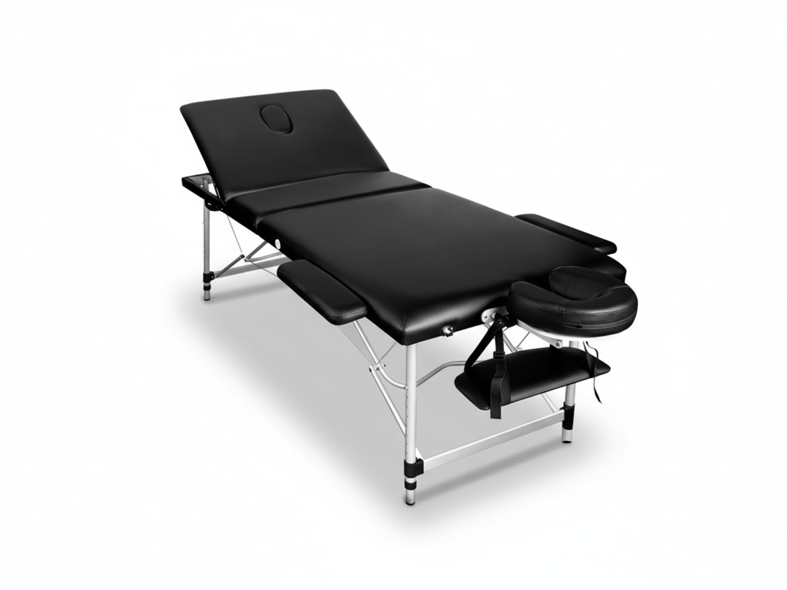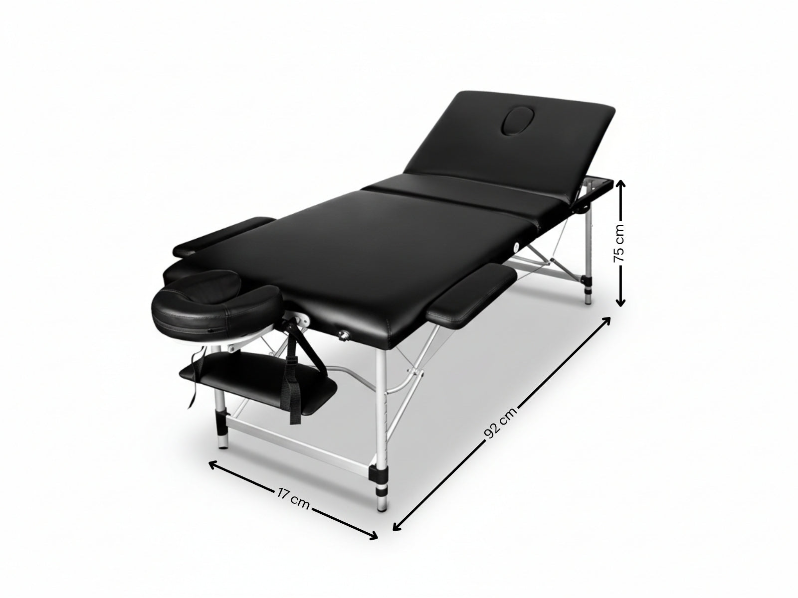 Living Galore is proud to bring you this Aluminium Portable 3 Fold Massage Bed which is ideal for a relaxing massage, featuring arm rests and a removable, adjustable face cradle with face hole. The high density foam ensures the maximum in comfort, while the oil and water-proof vinyl surface allows easy cleaning. This 3 section massage table has been designed with a new tilting mechanism to offer an increased vertical lift. The table is light yet firm with a sturdy aluminium frame that will support up to 250kg, while weighing only 17kg (without accessories) remains light allowing easy transport. Unlike many other tables on the market, this table can be easily folded away in seconds. With its own carry bag this portable, massage table offers exceptional value for money.