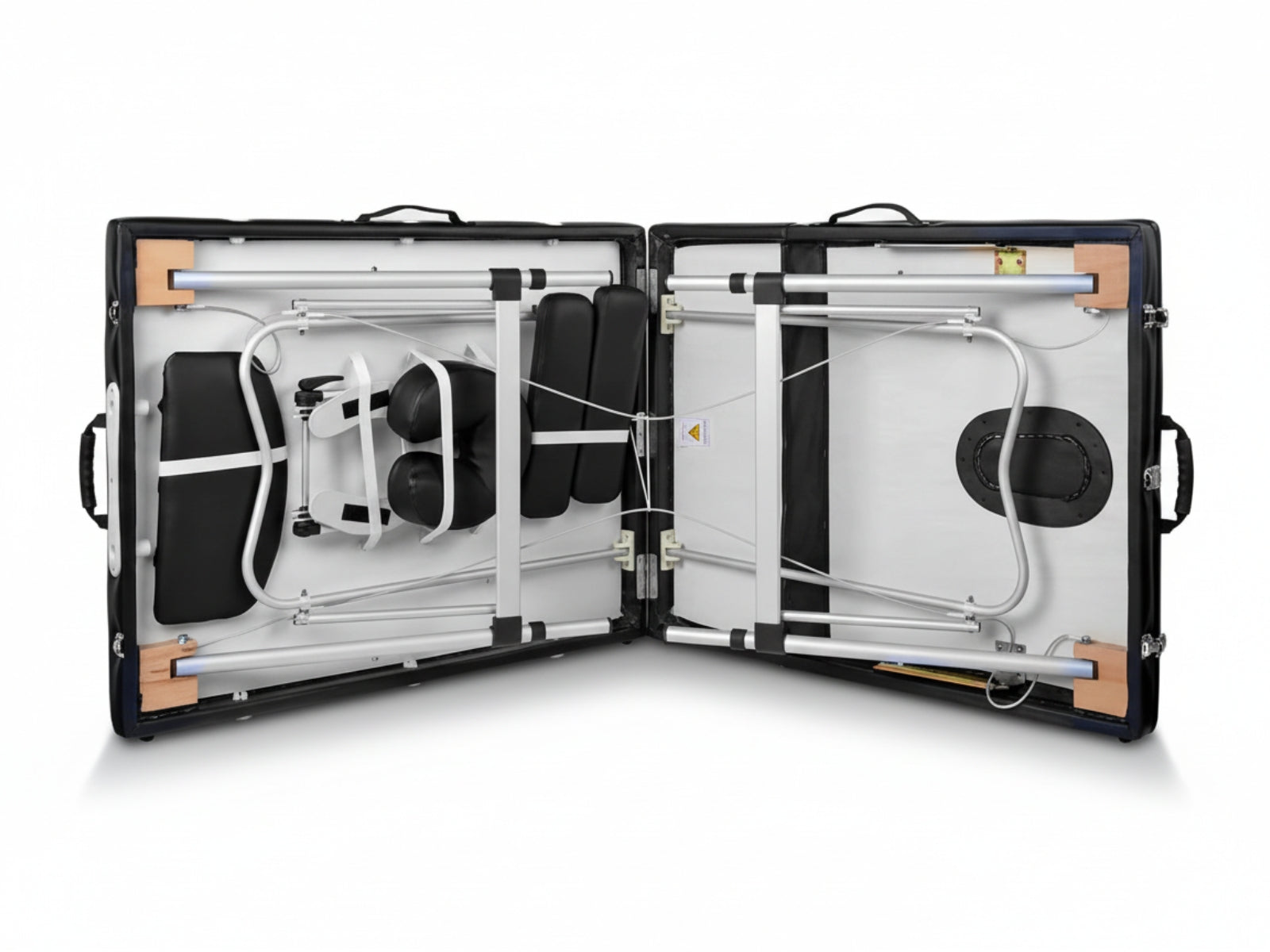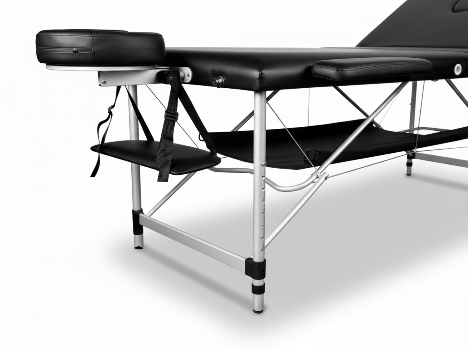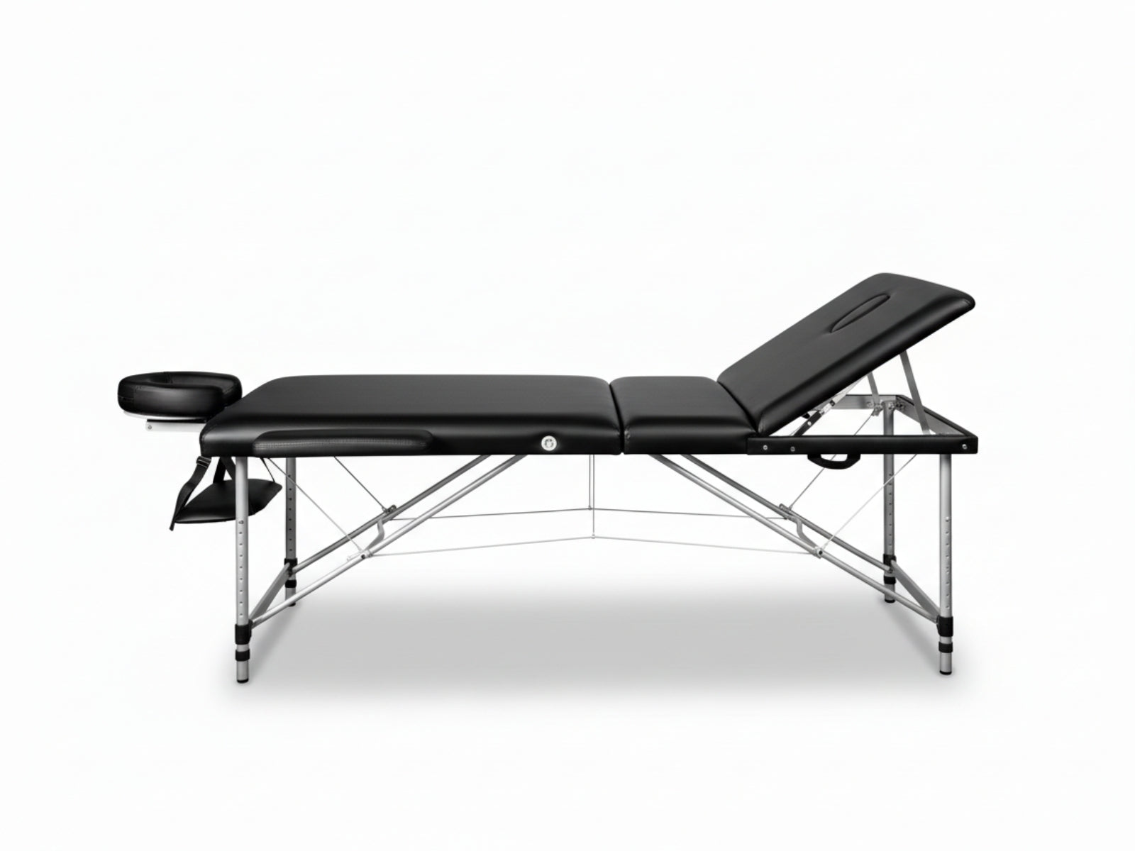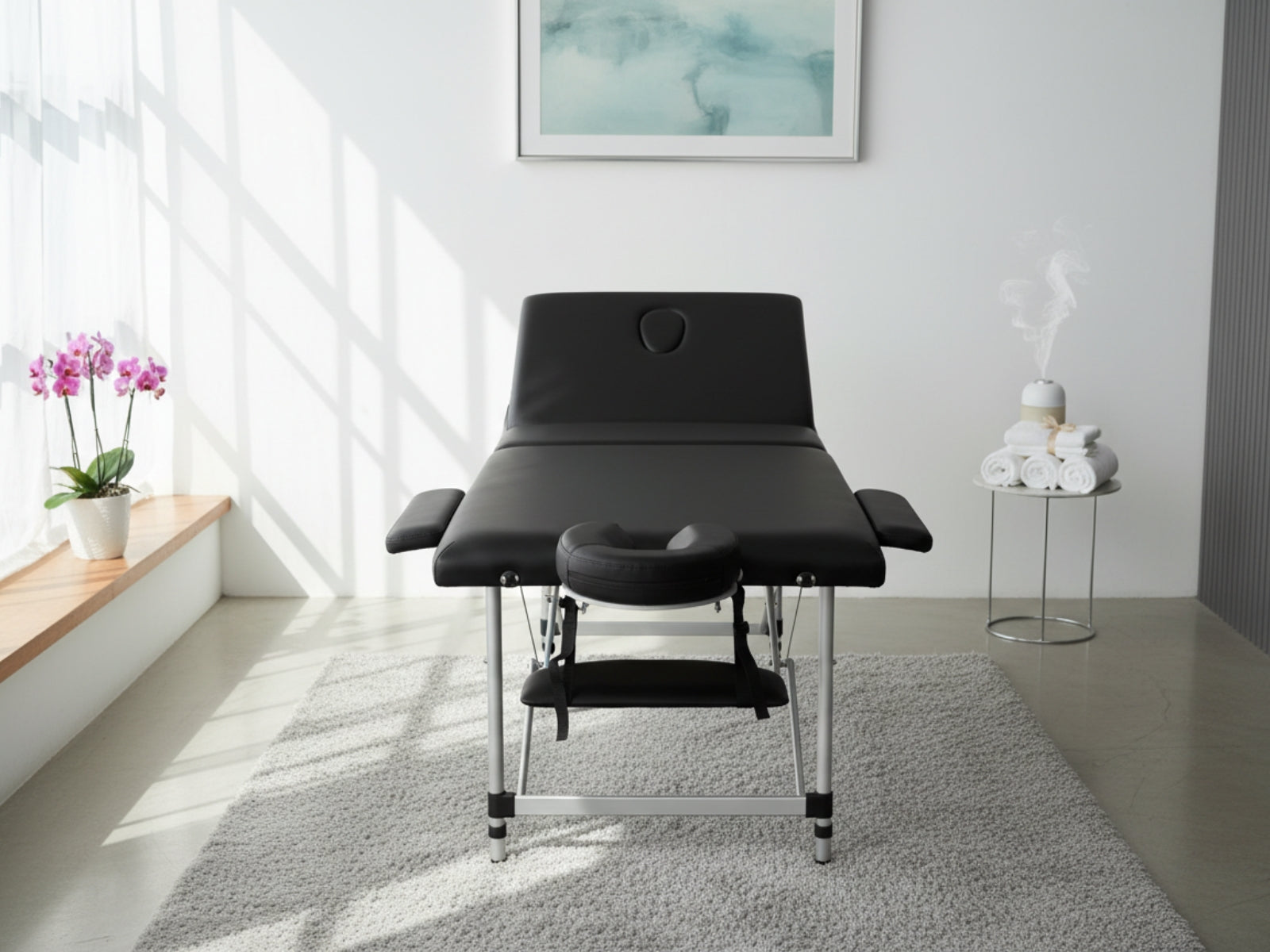 Living Galore is proud to bring you this Aluminium Portable 3 Fold Massage Bed which is ideal for a relaxing massage, featuring arm rests and a removable, adjustable face cradle with face hole. The high density foam ensures the maximum in comfort, while the oil and water-proof vinyl surface allows easy cleaning. This 3 section massage table has been designed with a new tilting mechanism to offer an increased vertical lift. The table is light yet firm with a sturdy aluminium frame that will support up to 250kg, while weighing only 17kg (without accessories) remains light allowing easy transport. Unlike many other tables on the market, this table can be easily folded away in seconds. With its own carry bag this portable, massage table offers exceptional value for money.