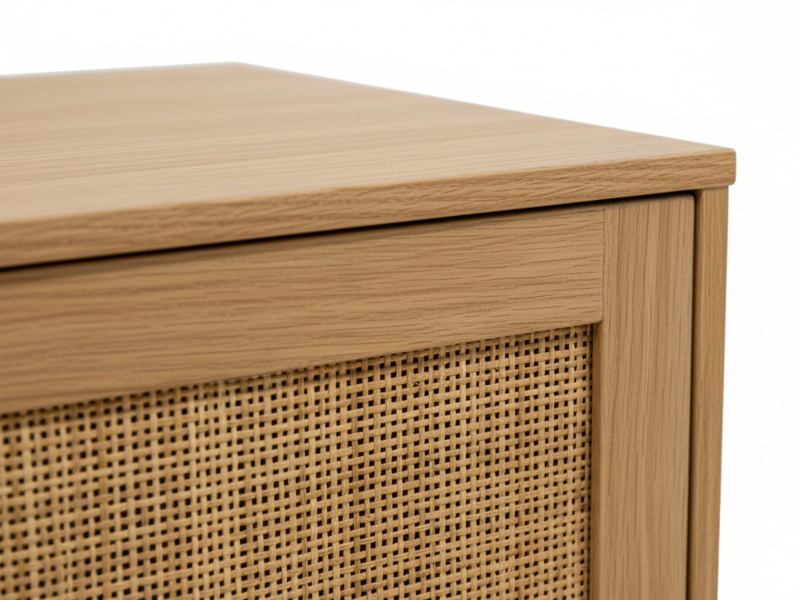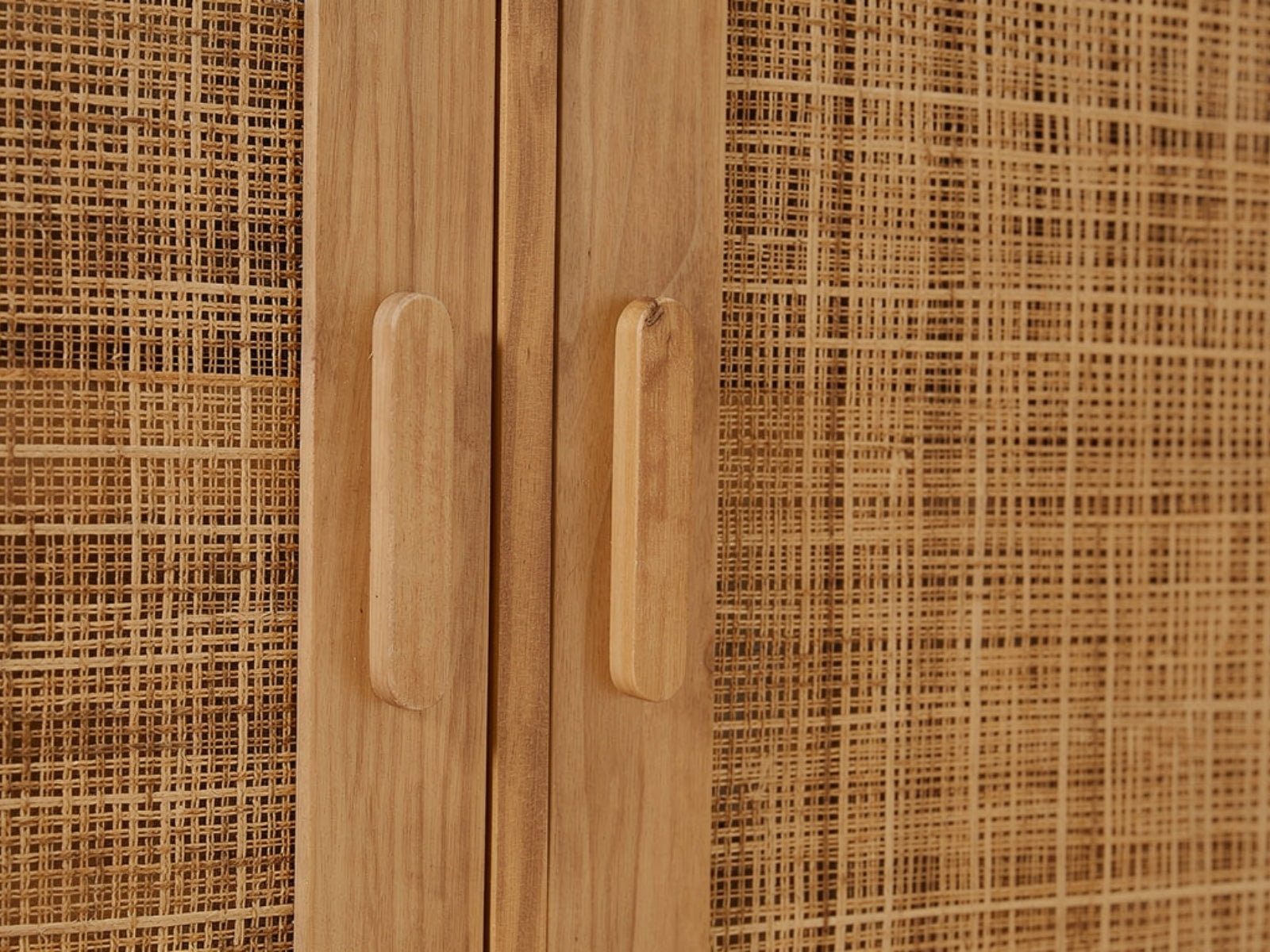 Looking for simple yet unique furniture? The Naturlig Collection brings natural charm and everyday function to your home. Bring lasting style to your space with the Naturlig Buffet Table. It is made from high-density particleboard with solid wooden legs. This sideboard is built to last. The Buffet Table comprises a large countertop and two-tier shelving within a three-door cupboard. You can use it in any space or in any room where a convenient and compact cabinet will do wonders for your storage needs. Hardware with anti-rust coating makes opening and closing cabinets easy. Plus, the rattan drawer front adds a natural touch and warm, textured charm. With its natural look and practical design, this Naturlig buffet table fits beautifully into any modern home.