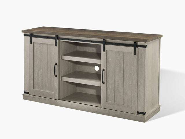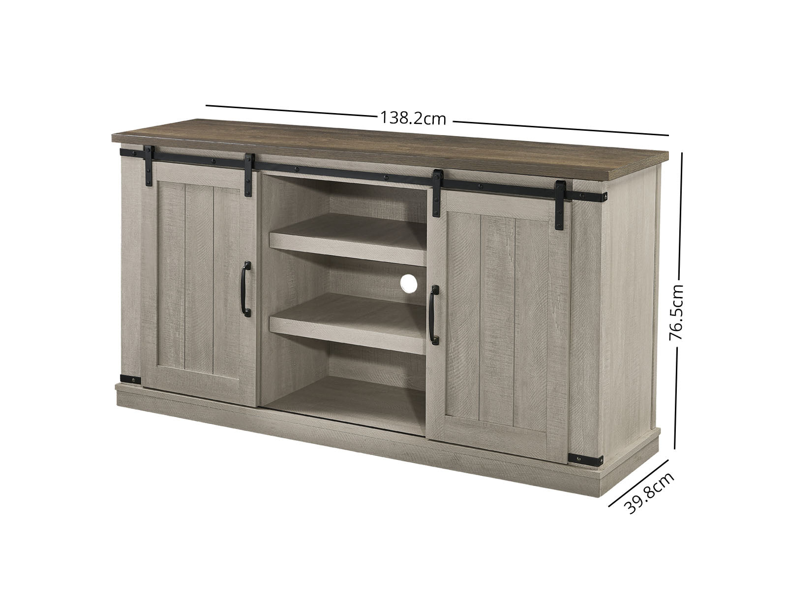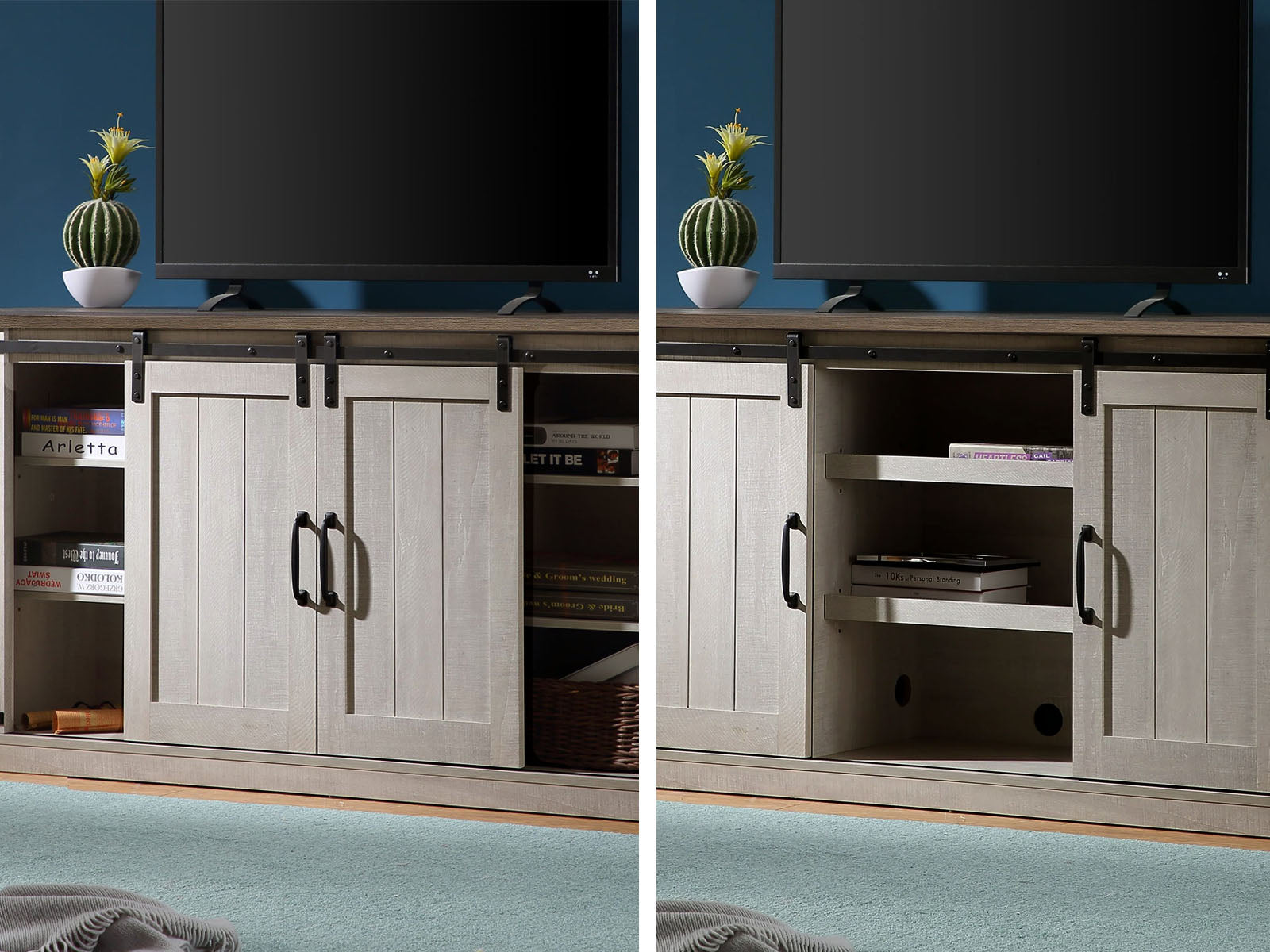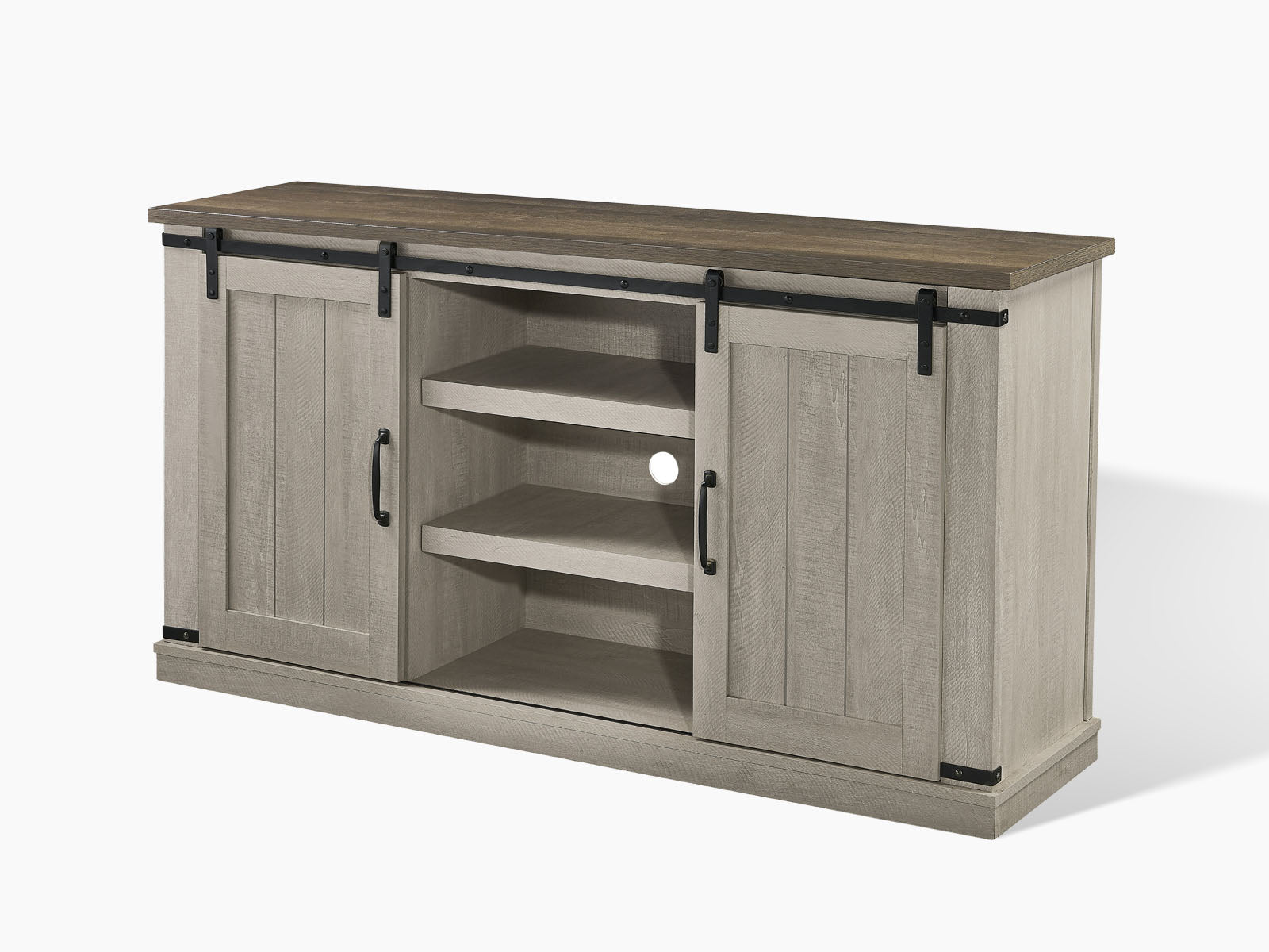 This TV stand brings style and ample storage to any living space. It's made from engineered wood with interior shelves for holding media players and DVDs, while shelves give you extra room for books and decorative items. It features a pair of barn-style doors that slide shut for added appeal, while metal hardware completes the aesthetic. It supports flat screens up to 60" and includes cable management cutouts, so you can keep your space clutter-free. This stand completes the look in any industrial or French country space.