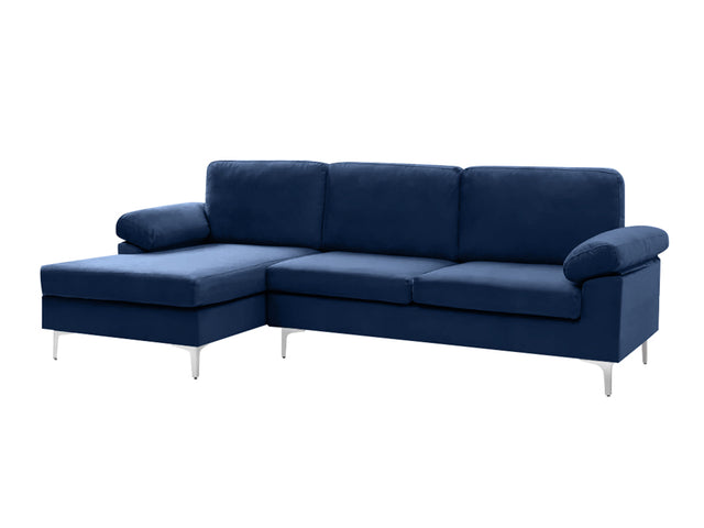 the Kaveah Velvet Sofa in blue offers the perfect blend of comfort and modern style. Built with a sturdy wood frame and upholstered in soft, durable velvet. This L-shaped sofa provides a cozy seating experience for relaxing, watching TV, or entertaining. Generous cushions and a wide armrest ensure excellent support. The left chaise design gives you room to stretch out. Solid metal legs add stability and a sleek finish. Suitable for various room styles, this sectional creates a warm and inviting space for family and friends.