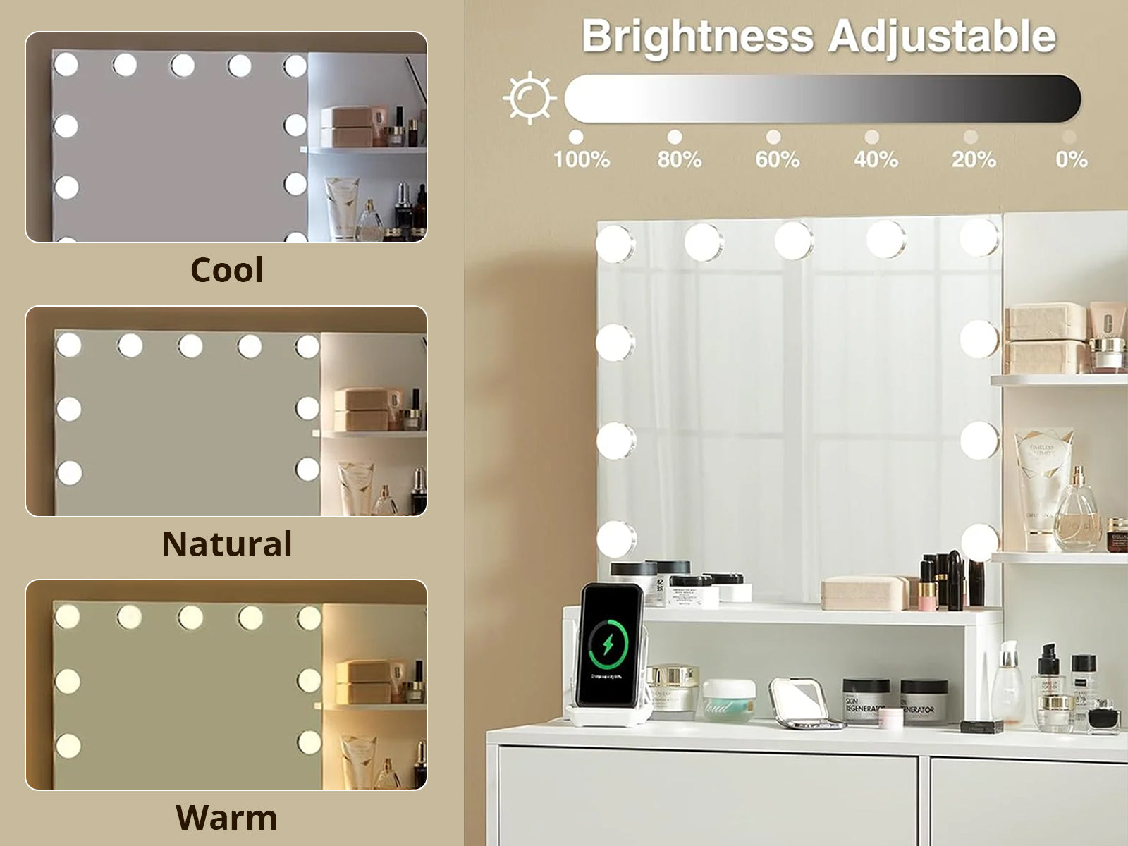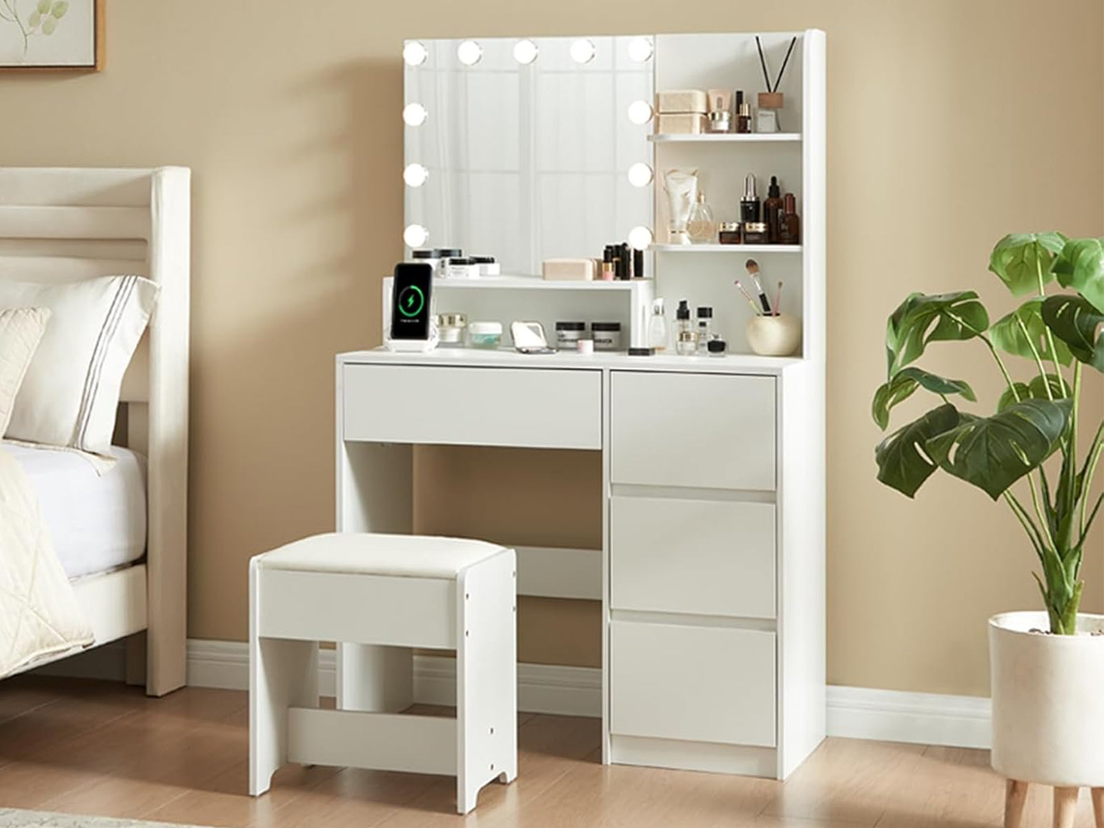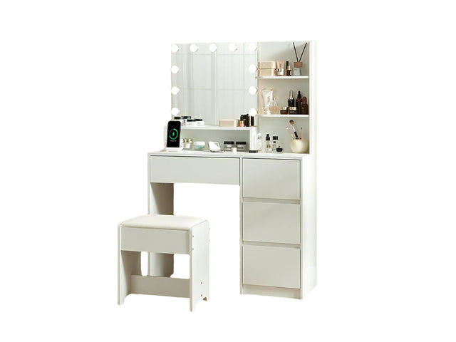 Makeup Vanity Desk Set with Mirror & Light D01 White. Enjoy salon-quality makeup at home with 3-color LED lighting (warm, natural, cool) and adjustable brightness. The clear mirror ensures precise application day or night. Stay connected with this vanity's built-in power station. Features a spacious tabletop, 4 drawers (including 1 large), and 4 open shelves to neatly organize makeup, skincare, and jewelry—keeping everything visible and within reach.More than just a vanity - this stunning set serves as both practical beauty station and tasteful home accent. An ideal present that will spark joy for wives, daughters, and loved ones during celebrations