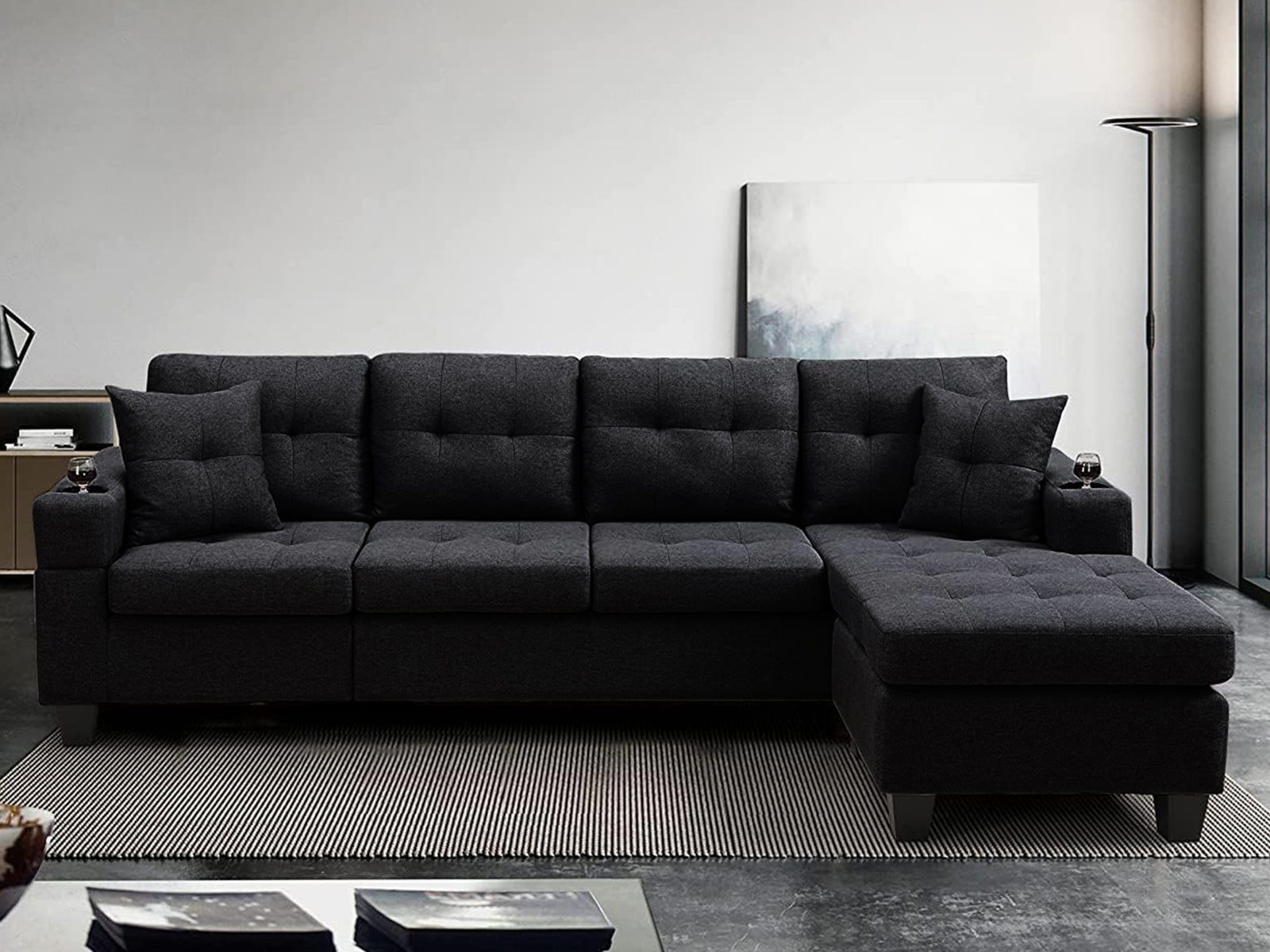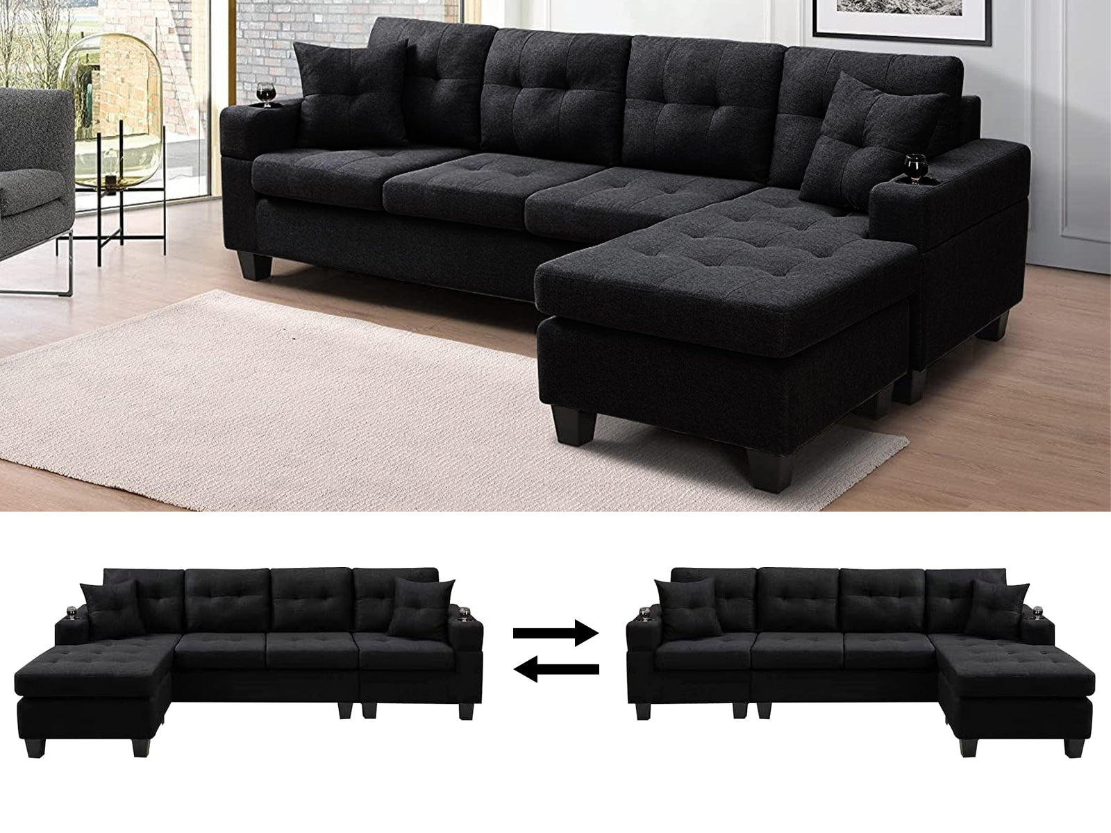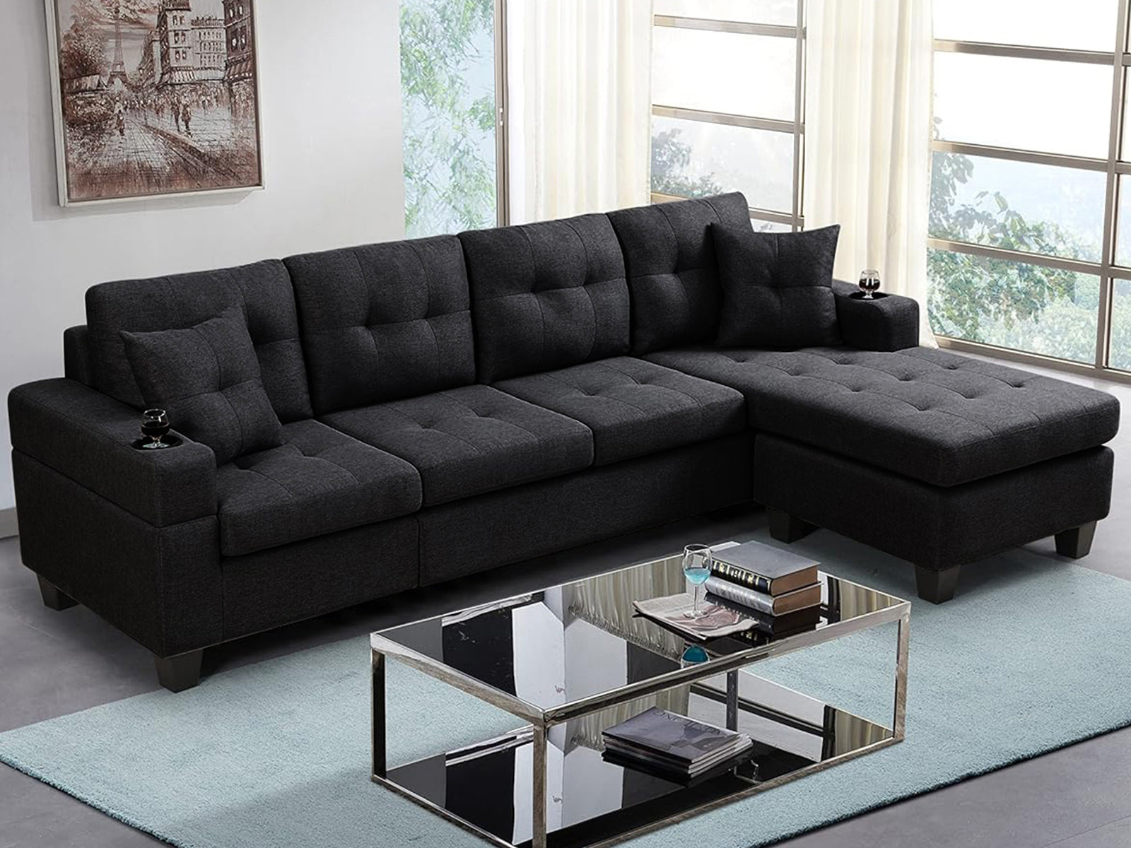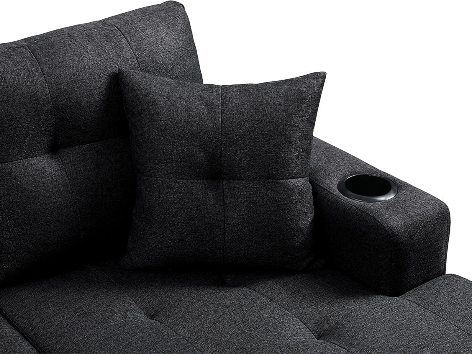 Upgrade your living room or apartment with this stylish and comfortable Sectional Sofa. The modern design features a backrest pull point and high-density foam that provide ultimate comfort and resilience. The plastic feet are wear-resistant and floor-friendly, ensuring a peaceful environment. It comes with double pillows of the same fabric and a bilateral cup holder, making it the perfect place to relax and unwind.