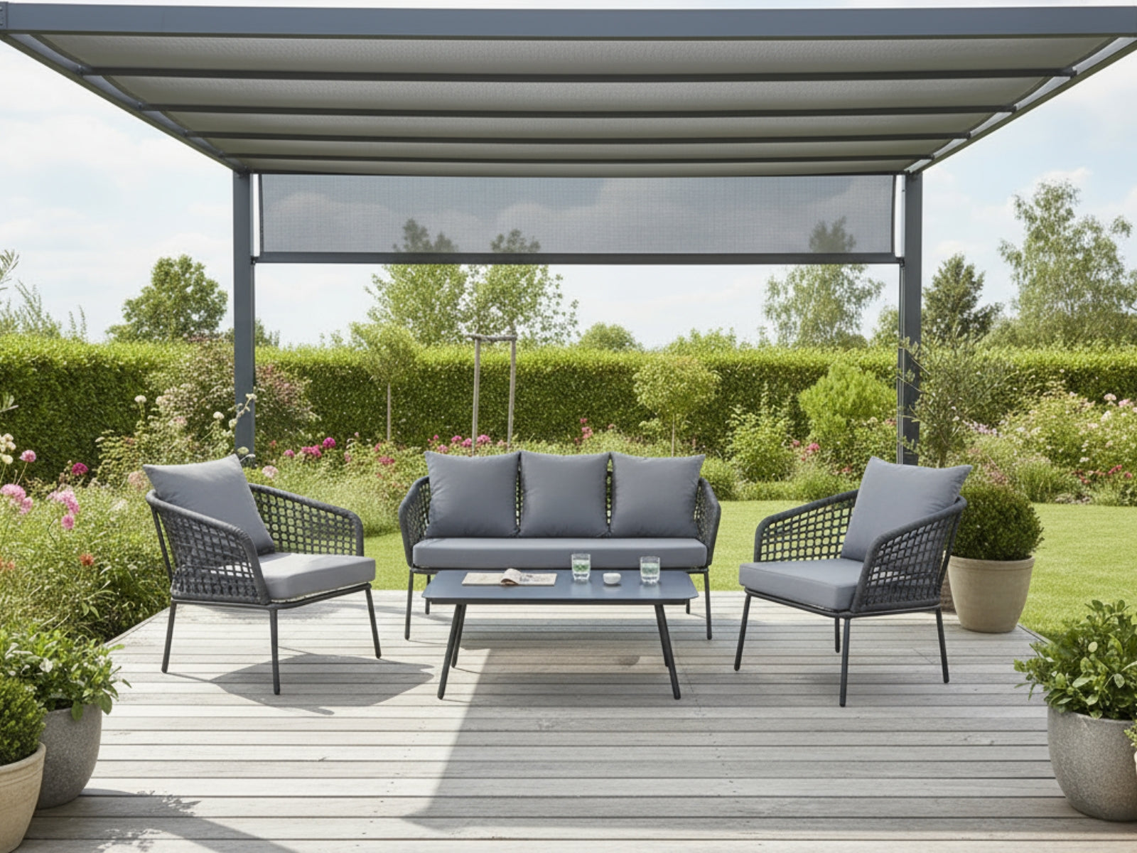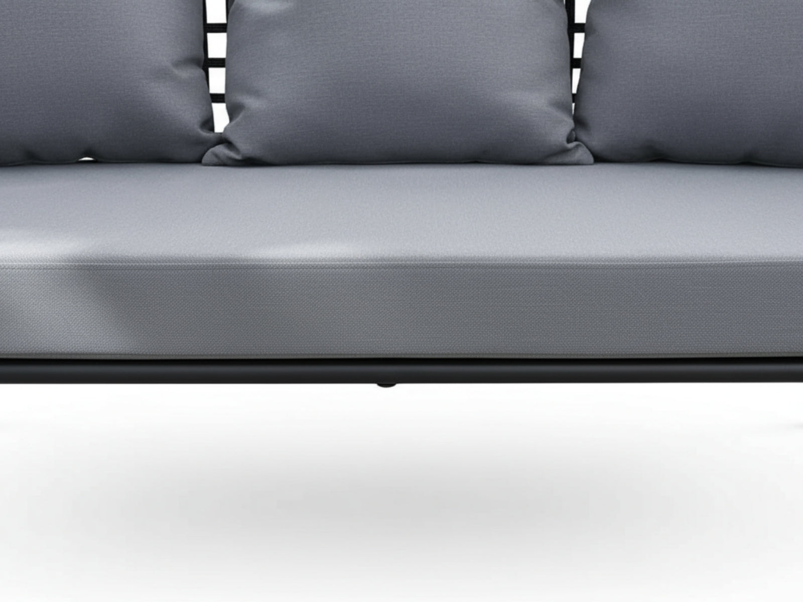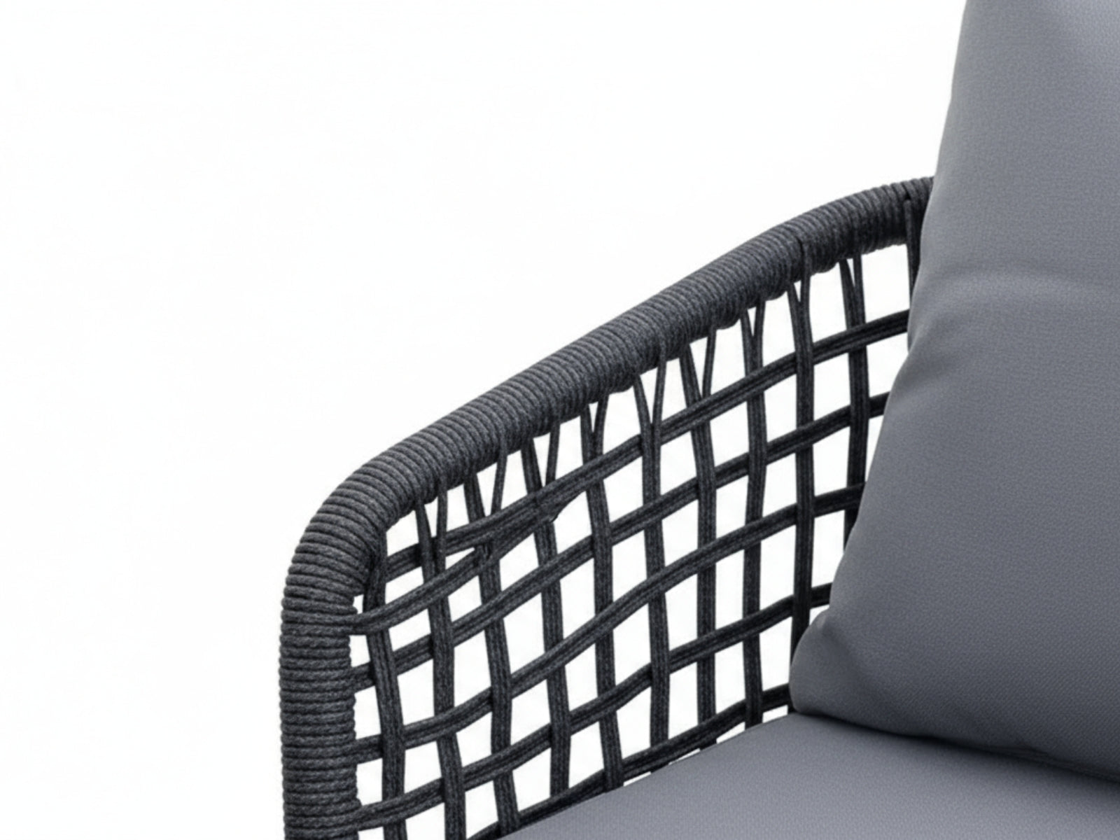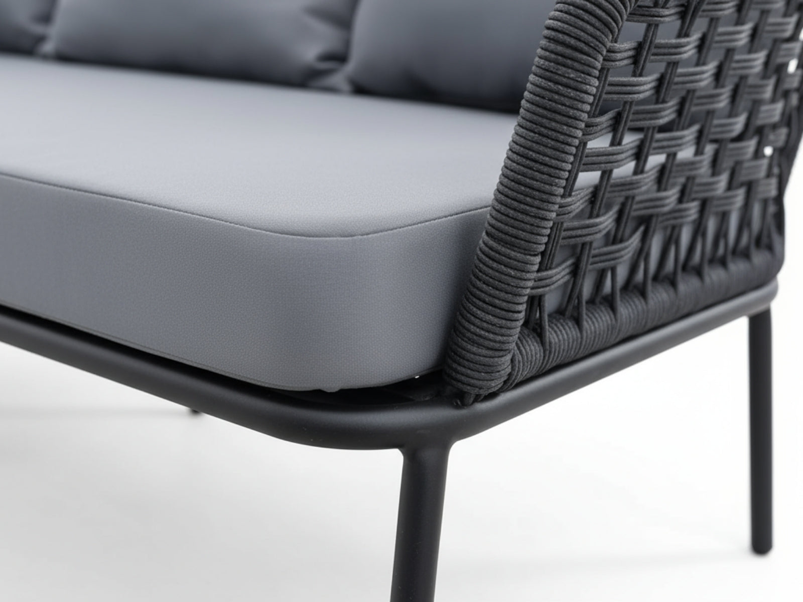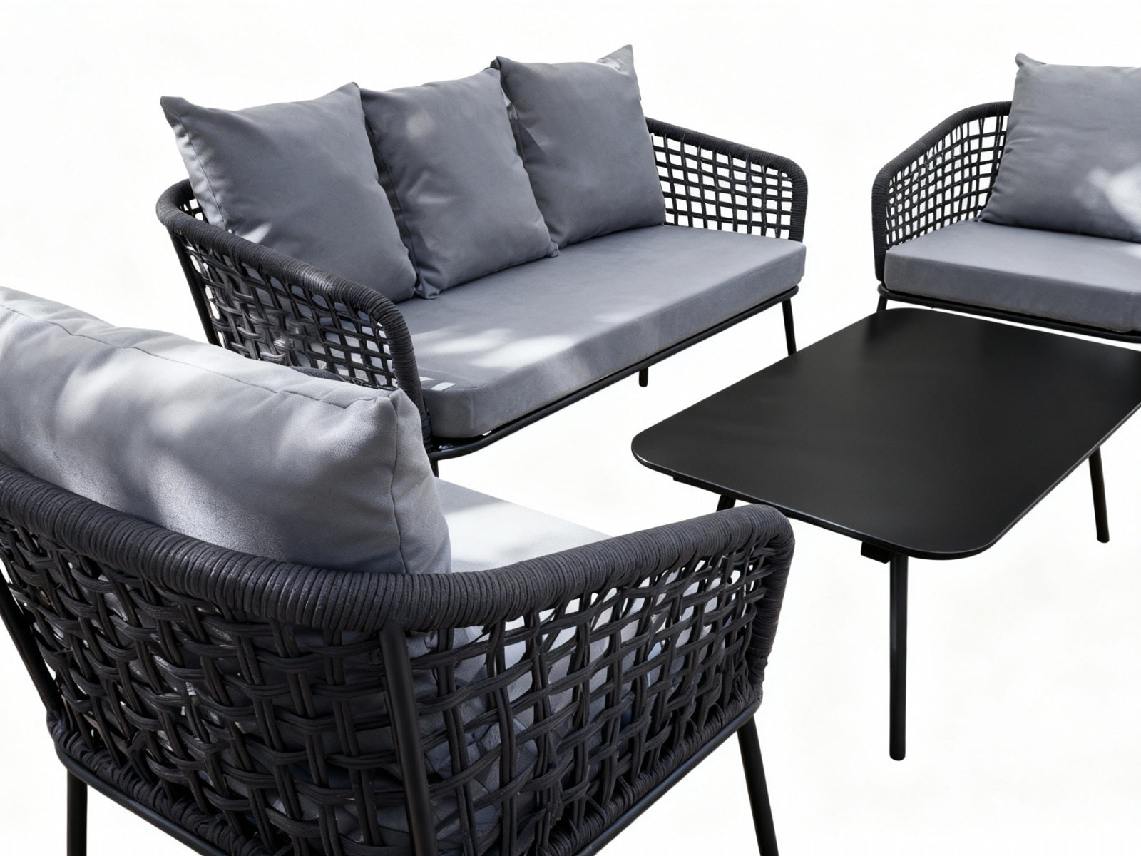 Gather family and friends for pleasant weather and good conversation with this outdoor sofa set. Boasting a contemporary modern look, it features woven polyester fabric rope seat back and flared powder-coated steel frame, tempered glass tabletops, and removable fabric cushions with plush thick, dense foam padding provide a relaxing spot to lounge. A versatile set designed for long-lasting durability, each piece in the sofa set can be mixed and matched and effortlessly arranged to fit the spontaneous needs of you and your guests.