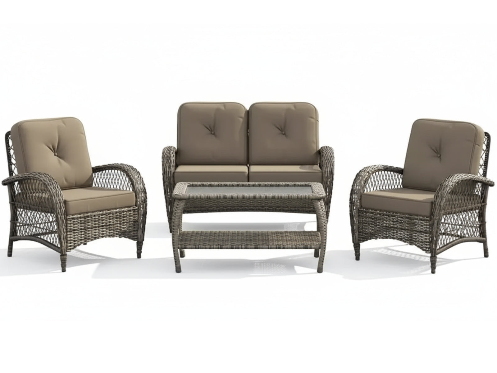 Bring comfort and style to your outdoor space with this wicker sofa set. The powder-coated metal frame combines with premium PE wicker to create a traditional and coastal style that's perfect for entertaining guests. The removable and washable polyester cushion covers in brown are amply padded for comfort, while the button-tufted seat backs add a touch of elegance. The water-resistant set includes a loveseat, two club chairs, and a coffee table with a glass top for drinks and snacks.
