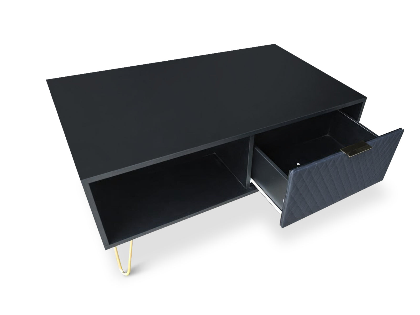 Where classic charm meets modern style, the Petunia Collection brings elegance to any space. With a bold black finish, navy blue grid-front upholstery, and gold metal handles and legs. This collection blends vintage flair with a refined modern touch. The golden accents add brightness and contrast, creating a look that’s timeless yet fresh. Perfect for adding a calm, elegant presence to your bedroom or living space. This Coffee Table offers durability and designer charm. The compact design fits easily in the living room, while the two spacious drawers offer smart storage—perfect for keeping your living area tidy and elegant.