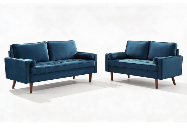 The Gyllene Velvet Sofa in blue includes a 2-seater and a 3-seater sofa. This Sofa set adds a touch of luxury and modern elegance to any space. Upholstered in premium velvet, it offers a smooth, soft texture that feels as good as it looks. Foam-filled seat cushions ensure lasting durability. The fibre-filled back cushions provide excellent comfort and support. With its sleek retro design and medium firmness, this sofa is perfect for relaxing, entertaining, or adding a stylish focal point to your living room. Built with a reinforced frame, it’s designed to last while complementing any décor style.