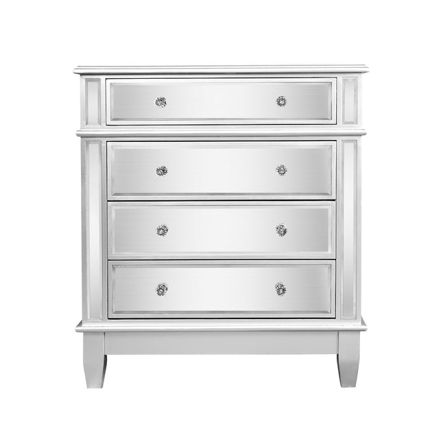 Bring a touch of elegance to your home with this vintage-style Mirrored 4-Drawer Chest. Distinctive Style makes it a timeless piece in the bedroom or any place. Clear reflective silver mirror surface visually magnifies the space, adding dimension to the space. The four drawers offer practical storage with decorative crystal knobs for a touch of luxury. Curved feet and beveled mirror details complete the look.