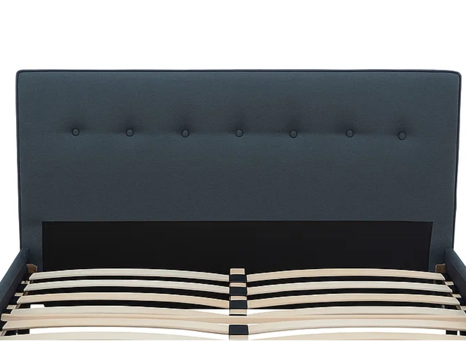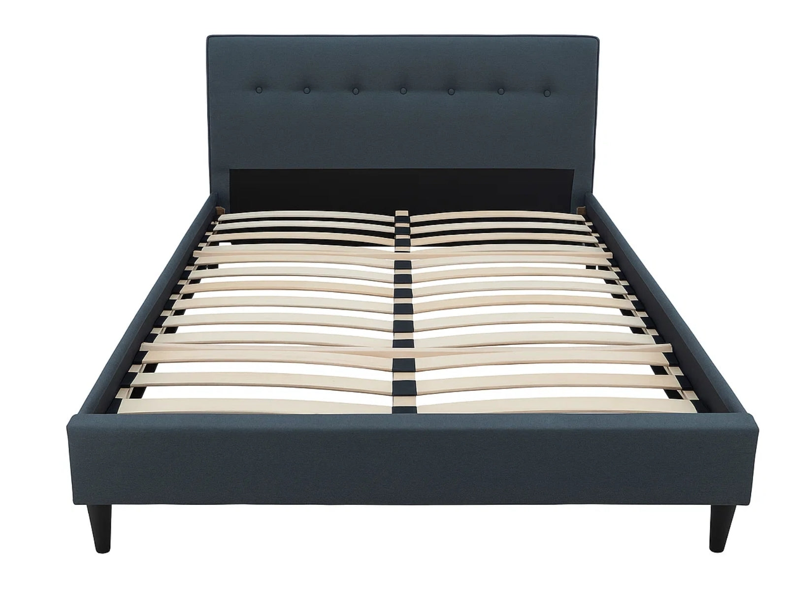 Material: Upholstered fabric, Wooden panels, Metal slat frame